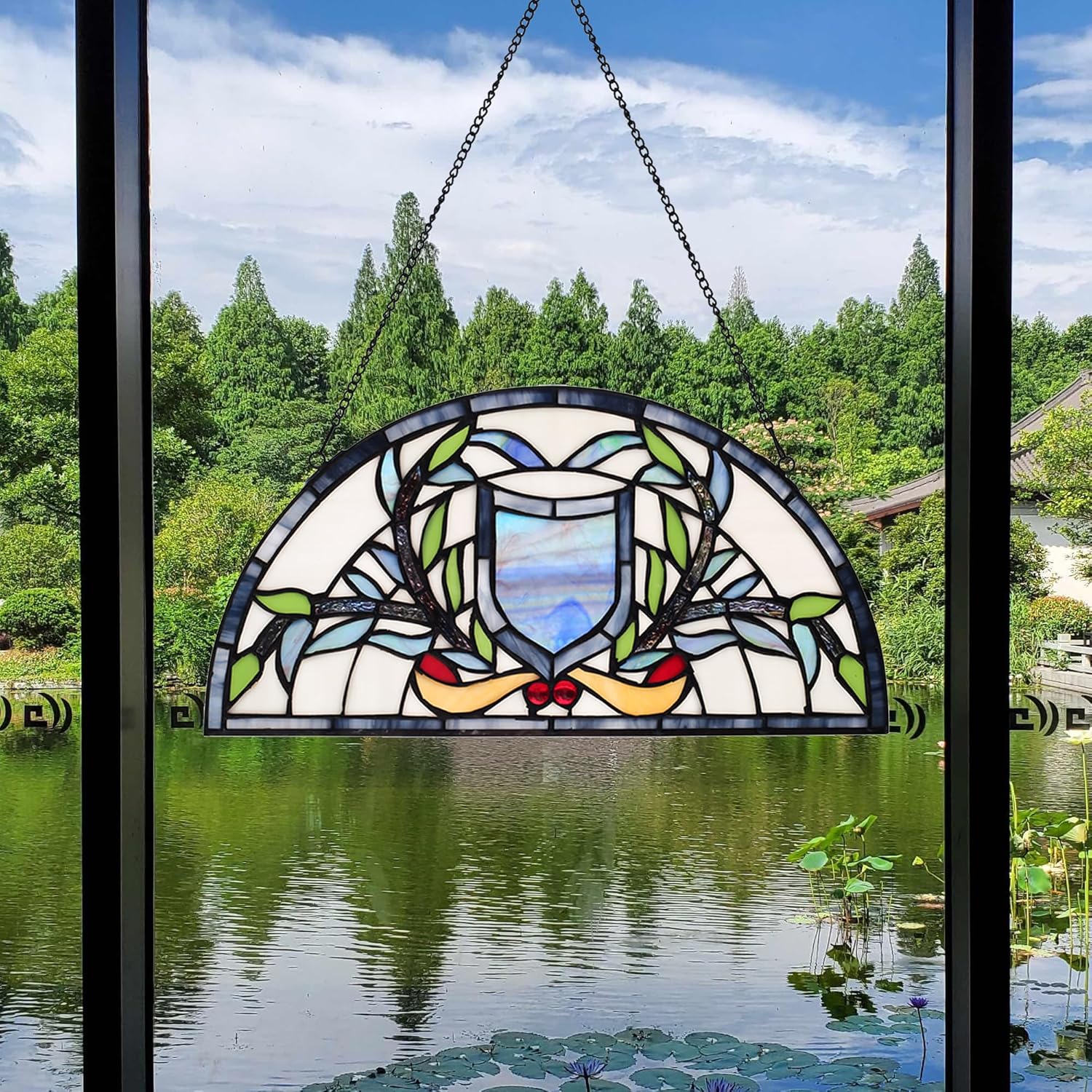 YOURANJU Half Moon Stained Glass Window Hanging Tiffany Style 16" x 8" Half-Round Window Panel Housewarming Gift Living Room Bedroom Kitchen Window Decorative Hangings with Chain (Rattan)