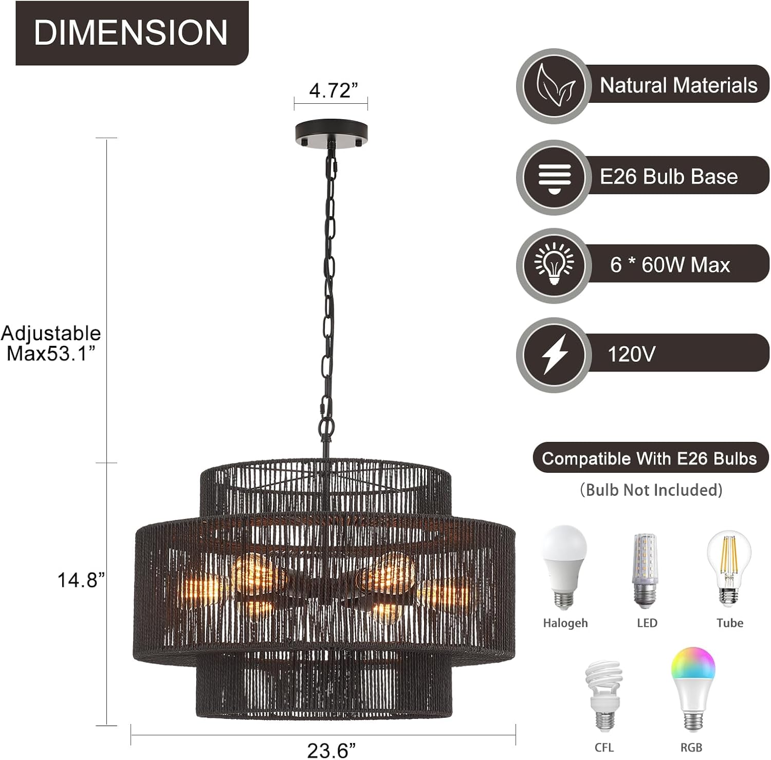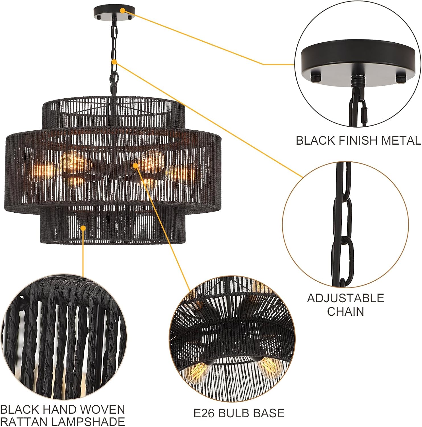 - 【Perfect Size】The boho wicker black chandelier with a 23.6" diameter and 14.8" height. Hanging chain can be adjusted, max 53.1", allowing you to achieve the perfect lighting arrangement for your needs.
