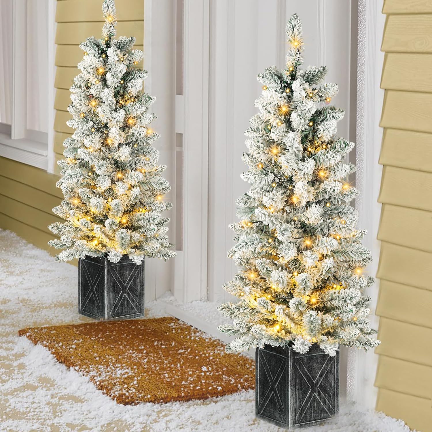 Set of 2 Christmas Trees with Lights 4-FT Artificial Potted Porch Snow Flocked Christmas Tree Battery Powered with 8 Modes and Timer for Indoor Outdoor