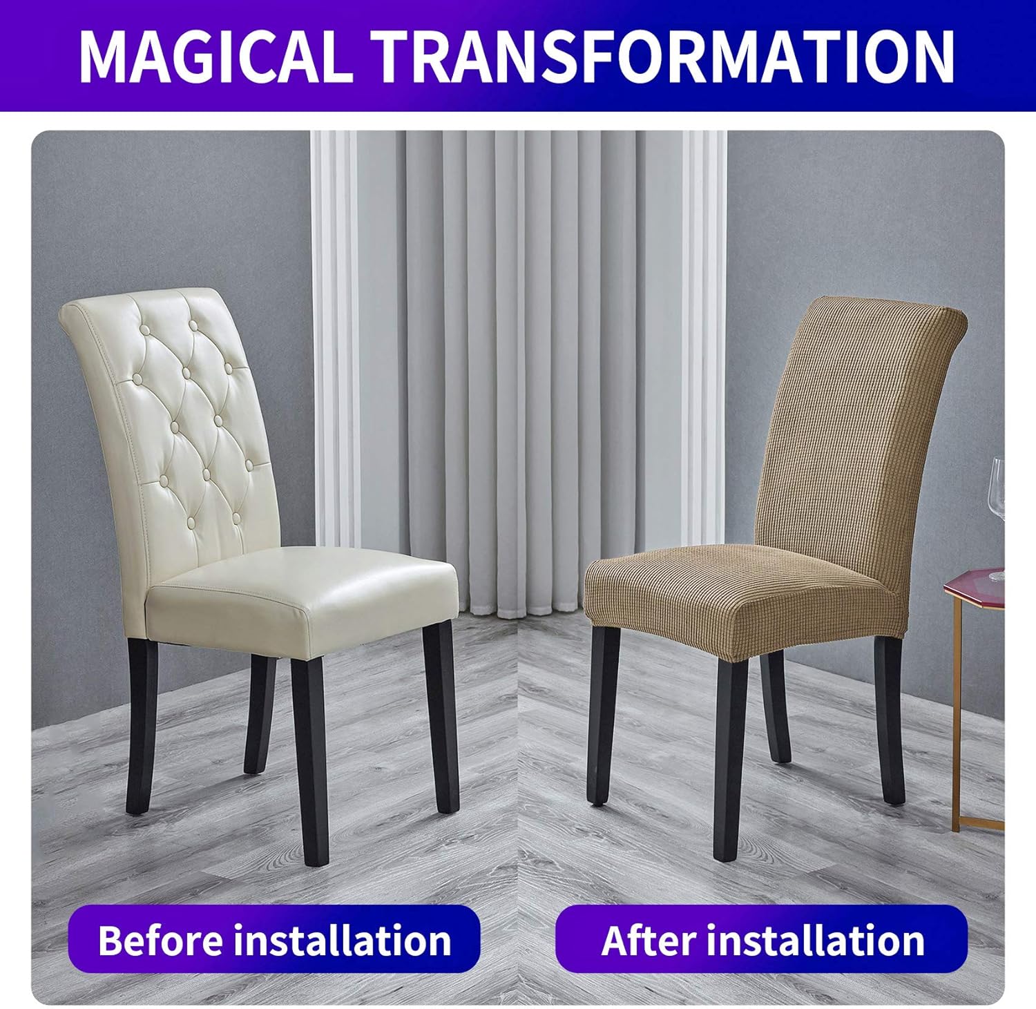 - Easy Installation, Simple Care. Easily slip on, instantly transform chairs to a brand new look. Machine washable in cold water, gentle cycle, no bleach, Ironing free.
