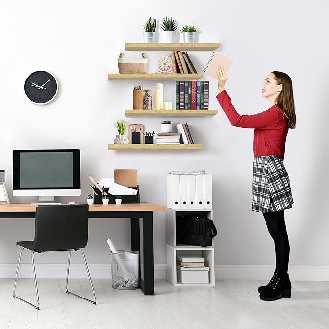 - Versatile & Functional Floating Wall Shelves: Install these floating shelves in the bedroom or bathroom to hold beauty/hair products - Place your wall shelf under a mirror in the entryway or exhibit family photos gallery style in a long hallway - Use as bathroom shelf, book shelf for wall, wall decor for bedroom, over the toilet shelf, kitchen floating shelves, floating nightstand, kitchen decor, living room wall decor, display shelf, and more