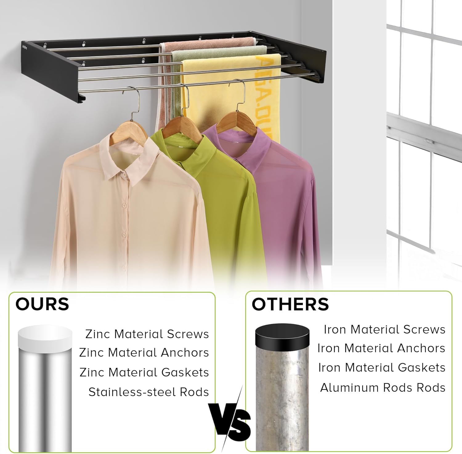 Wall Mounted Laundry Drying Rack, Retractable Clothes Drying Rack for Bathroom with Wall Template, 5 Stainless Rods Heaving 60 lb Capacity (Black, 31.5")
