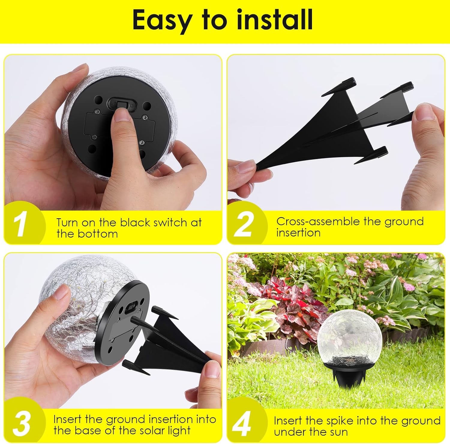 - 2 Easy Install Way: Solar powered, no battery or outlet needed, super convenient to use. It just need only 10-15 seconds to install the solar lights on places it absorb full and direct sunlight. The solar globe lights outdoor can be placed on the table, floor or inserted into the ground with a plug-in board. Try to soften the ground with water and dig a suitable hole for the spike if the ground is too hard