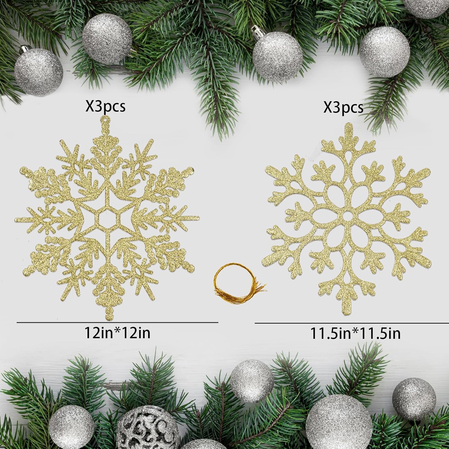 - LARGE SNOWFLAKES: Pack of 6pcs big gold snowflakes in two different styles measuring about 12" and 11.5" in height, large size snowflakes ornaments great for both indoor and outdoor winter Christmas decorations