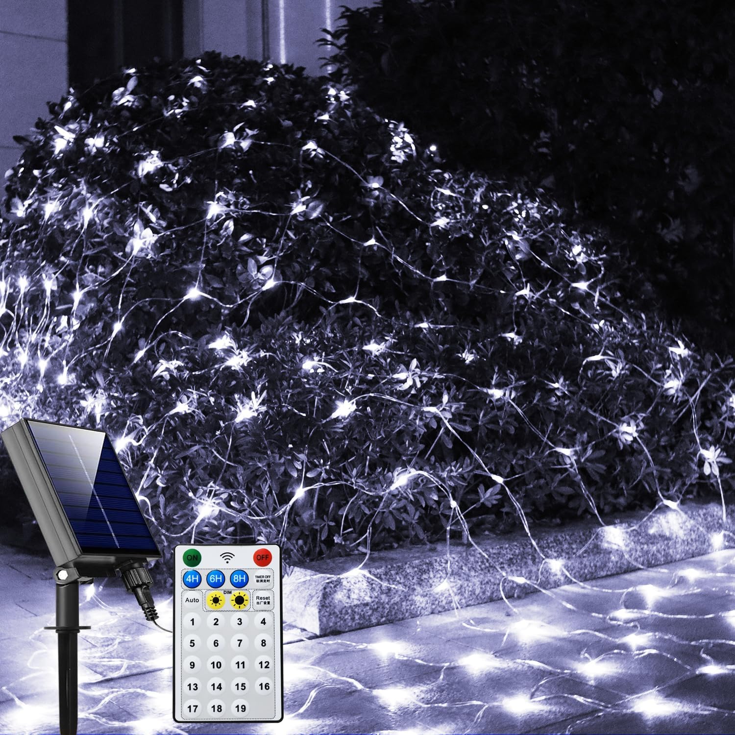 - 1.Solar Net Lights - The net light has an upgraded solar panel, which can be used for outdoor decoration for a longer time. Just press the button to turn on the light, it will automatically charge during the day, and then turn on automatically when it's dark.
