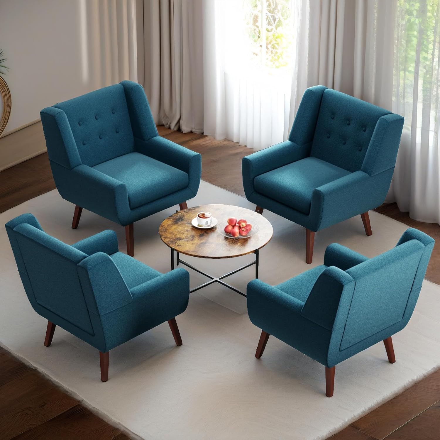 HUIMO Accent Chairs Set of 4, Upholstered Button Tufted Armchair, Linen Fabric Sofa Chairs for Bedroom, Living Room, Mid Century Modern Comfy Reading Chair (Lake Blue)