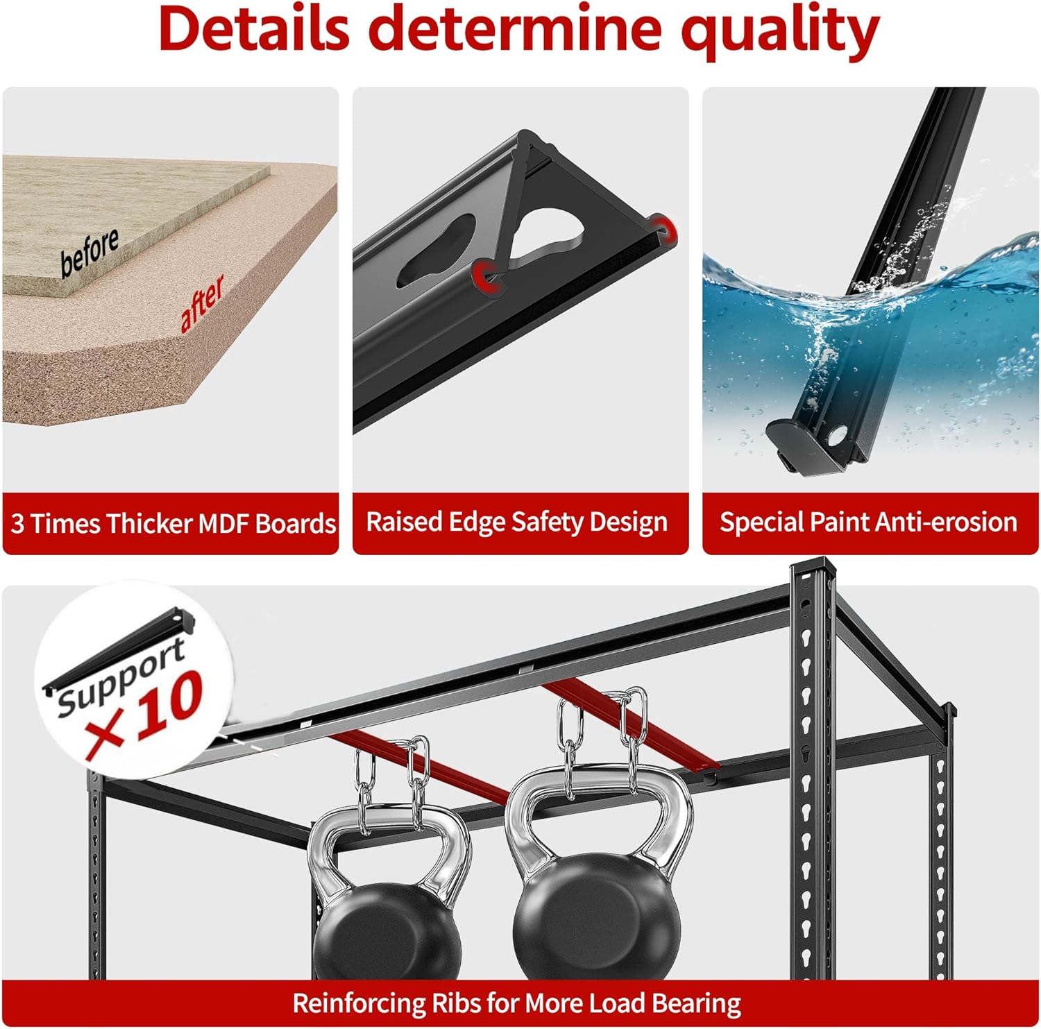- 【3000LBS Capacity & 10 Support Ribs Garage Shelving】Garage shelving is made of heavy duty metal. We have 2 support rods under each layer of MDF for this storage shelves, which can further increase the load bearing to meet ur needs for placing heavy objects. The thickened single-layer load-bearing capacity 600LBS and the total load-bearing capacity of 3000LBS. It is suitable for garage, workplaces, living room, kitchen, to store camping equipment, tools, kitchen supplies