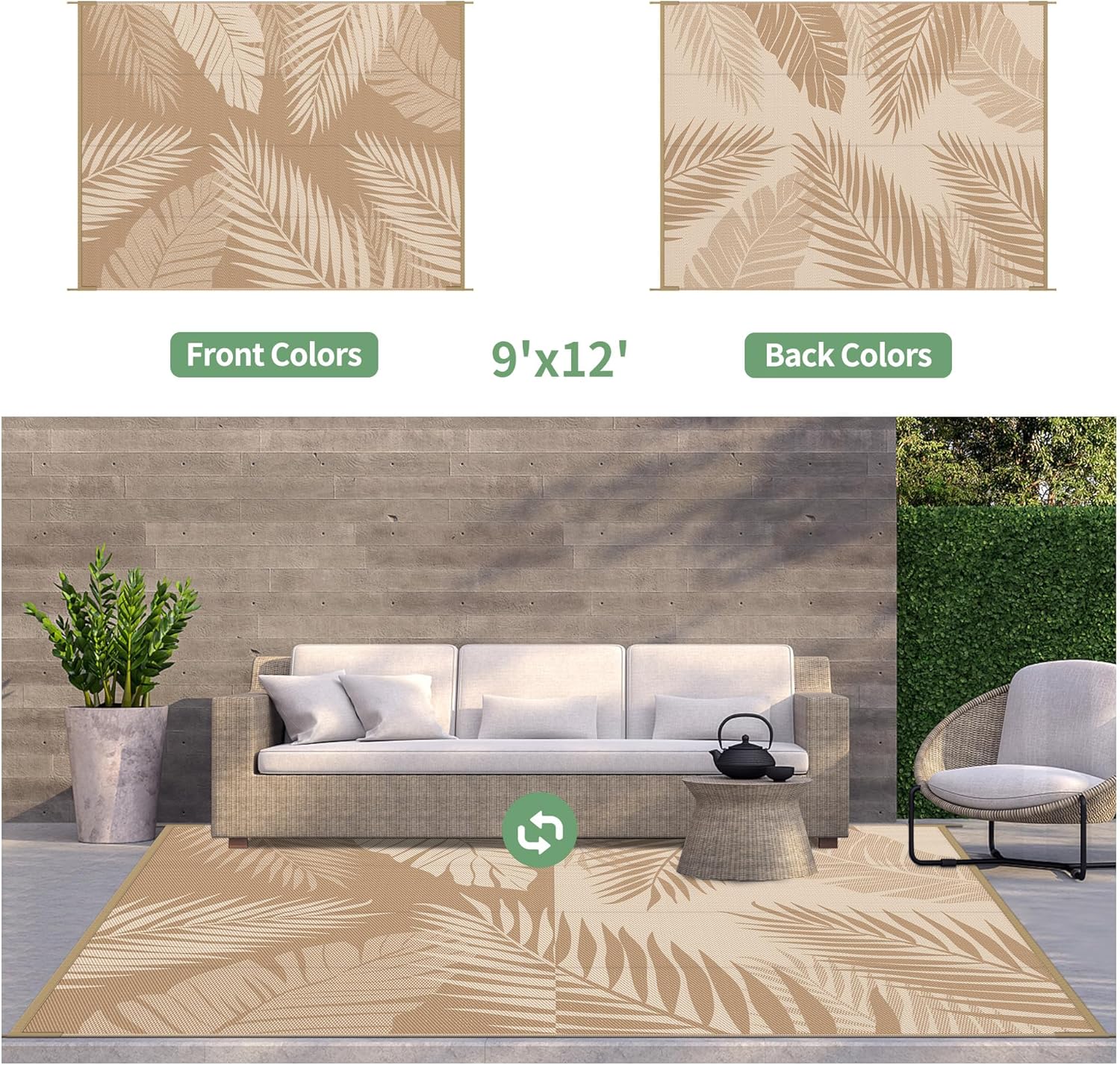 GENIMO Outdoor Rug 9' x 12' Waterproof for Patios Clearance, Reversible Outdoor Plastic Straw Camping Rug Carpet, Large Area Rugs Mats for RV, Camper, Deck, Balcony, Porch, Beach, Picnic, Brown&Beige