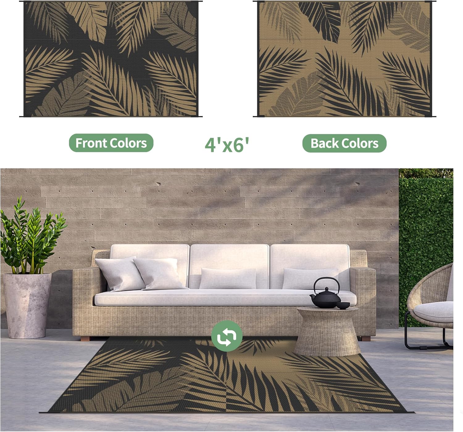 GENIMO Outdoor Rug 4' x 6' Waterproof for Patios Clearance, Reversible Outdoor Plastic Straw Camping Rug Carpet, Large Area Rugs Mats for RV, Camper, Deck, Balcony, Porch, Beach, Picnic, Black&Brown