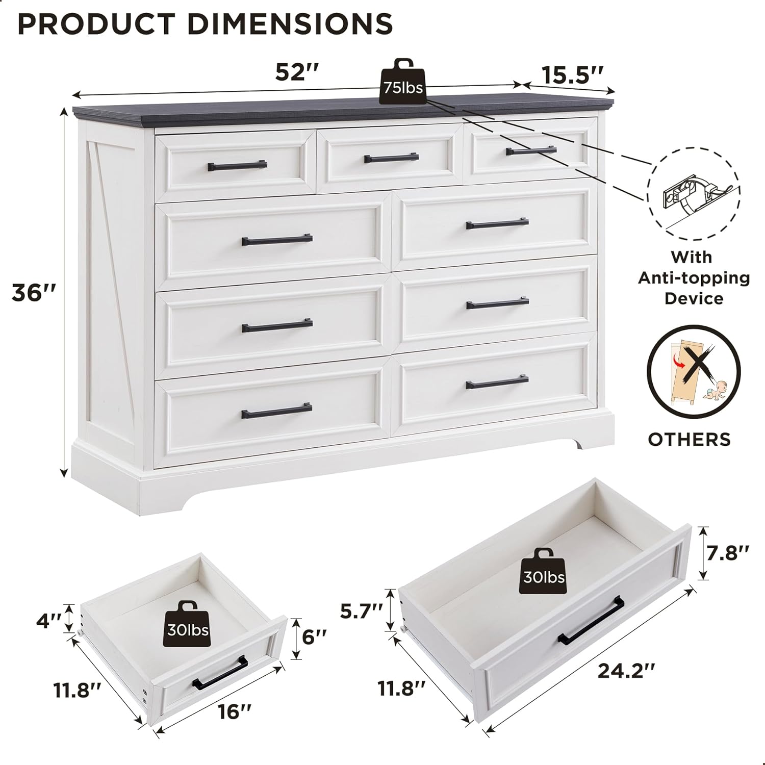 Farmhouse 9 Drawer Dresser for Bedroom, 36 Inch Tall Modern Dresser TV Stand with Large Drawers & Bar Handles, Rustic Wood Chest of Drawers for Bedroom, Living Room, Hallway, Off White