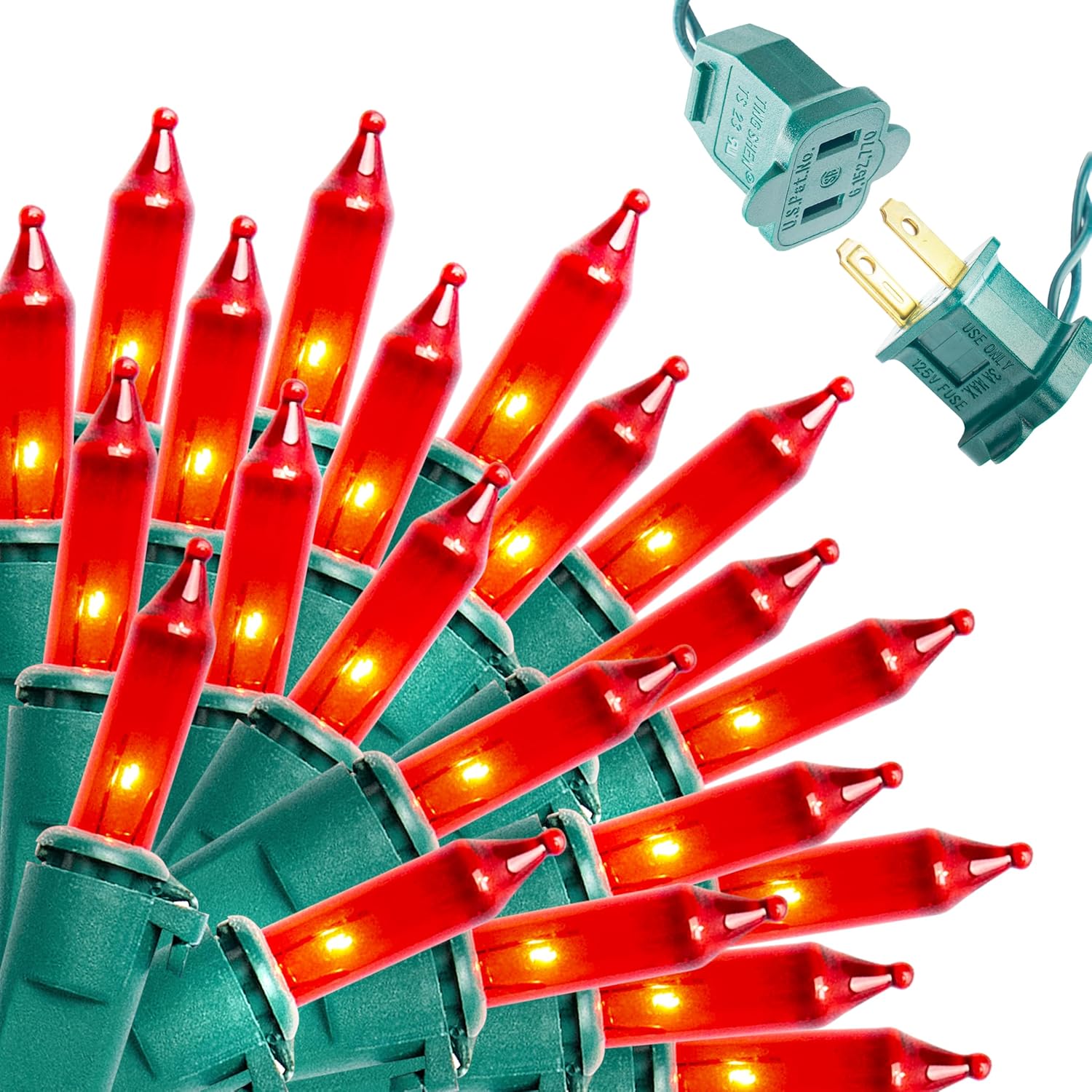 - Super Value Pack. Our Halloween incandescent string lights have a total of 100 incandescent red T5 bulbs with green wire. 40.8W 120V. Total Lighted Length is 19.4 Feet. Total Wired Length is 21.4 Feet. Bulb Spacing 2.36 inches. High Voltage.