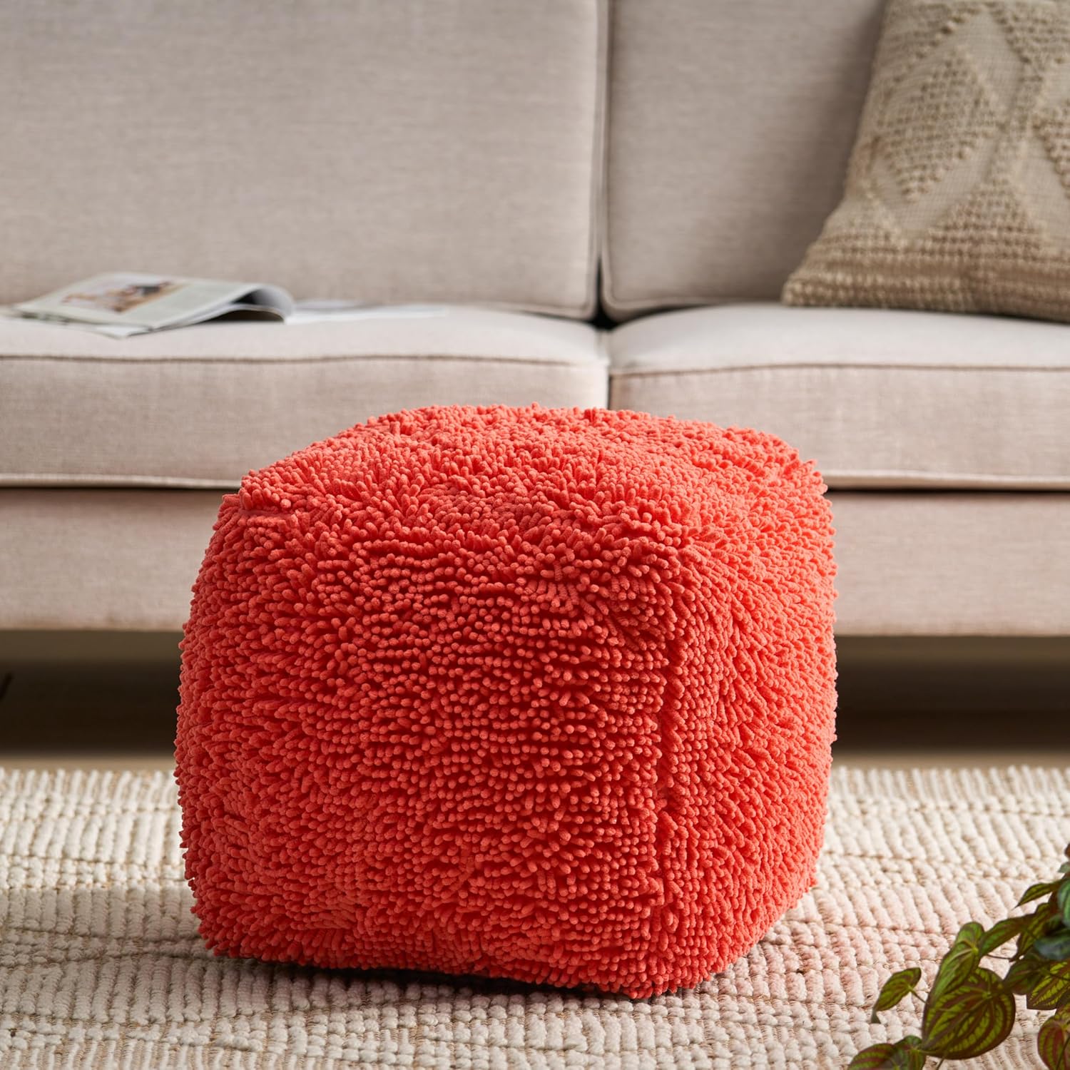 GDFStudio Modern Microfiber Chenille Cube Pouf Ottoman Foot Stool - Bean Bag Floor Chair - Foot Rest Couch for Living Room Bedroom,Coral,16"" x 16"" x 16"", Statha,coral, 314105N