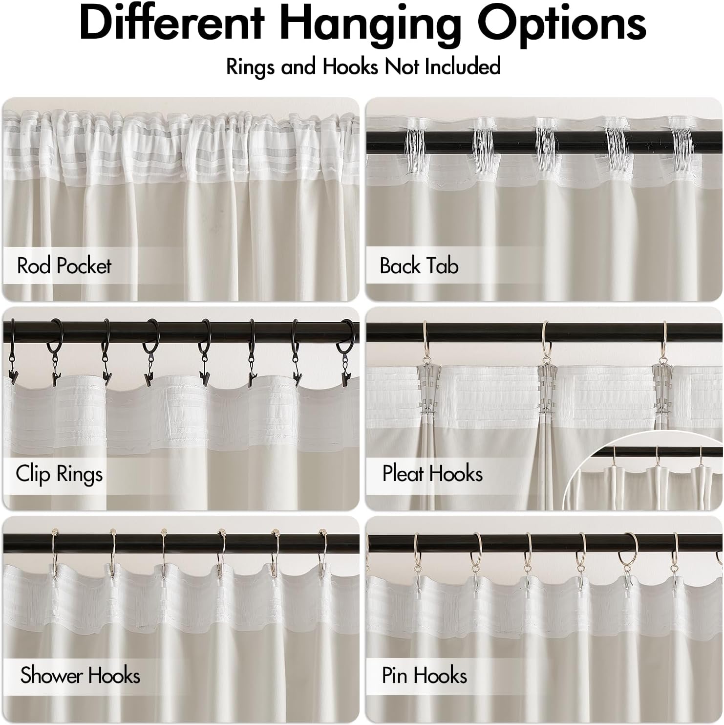 - HANGING OPTIONS: Each curtain panel has 3-in-1 top style design: rod pocket, back tab and pinch pleat. Back loop (2.3 inch) and rod pocket (3.1 inch) fit most standard rod. Curtains also can be hung with clip rings or curtain hooks. 3 ways to meet your various needs.