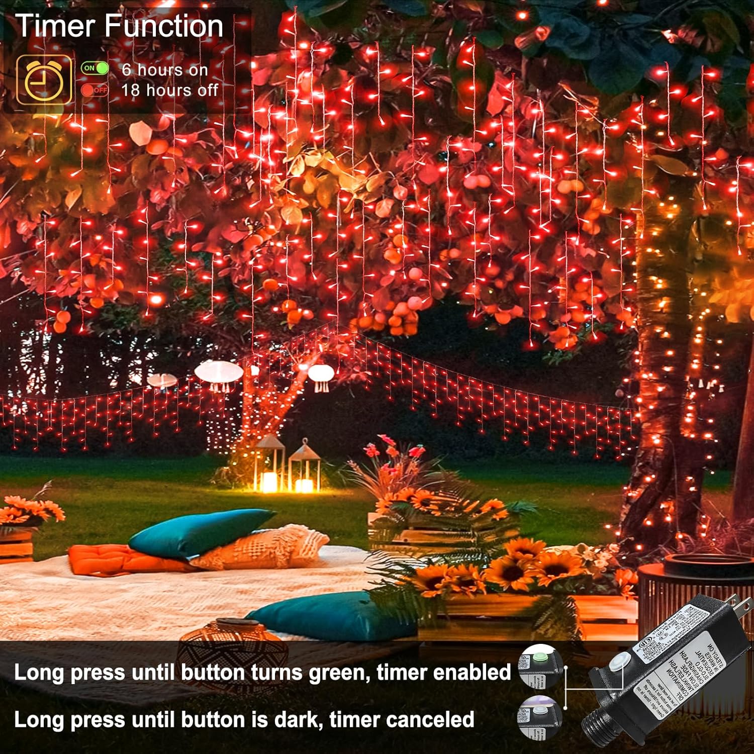 - 【Memory and Timer Function】The icicle lights could recover from the previous setting mode when you restart, no need to reset the mode every time. Press and hold the button on the adapter for 3 seconds until the green light on, then the timer function start, 6 hours on 18 hours off. This smart and convenient icicle string lights is the best choice for your holiday decoration.