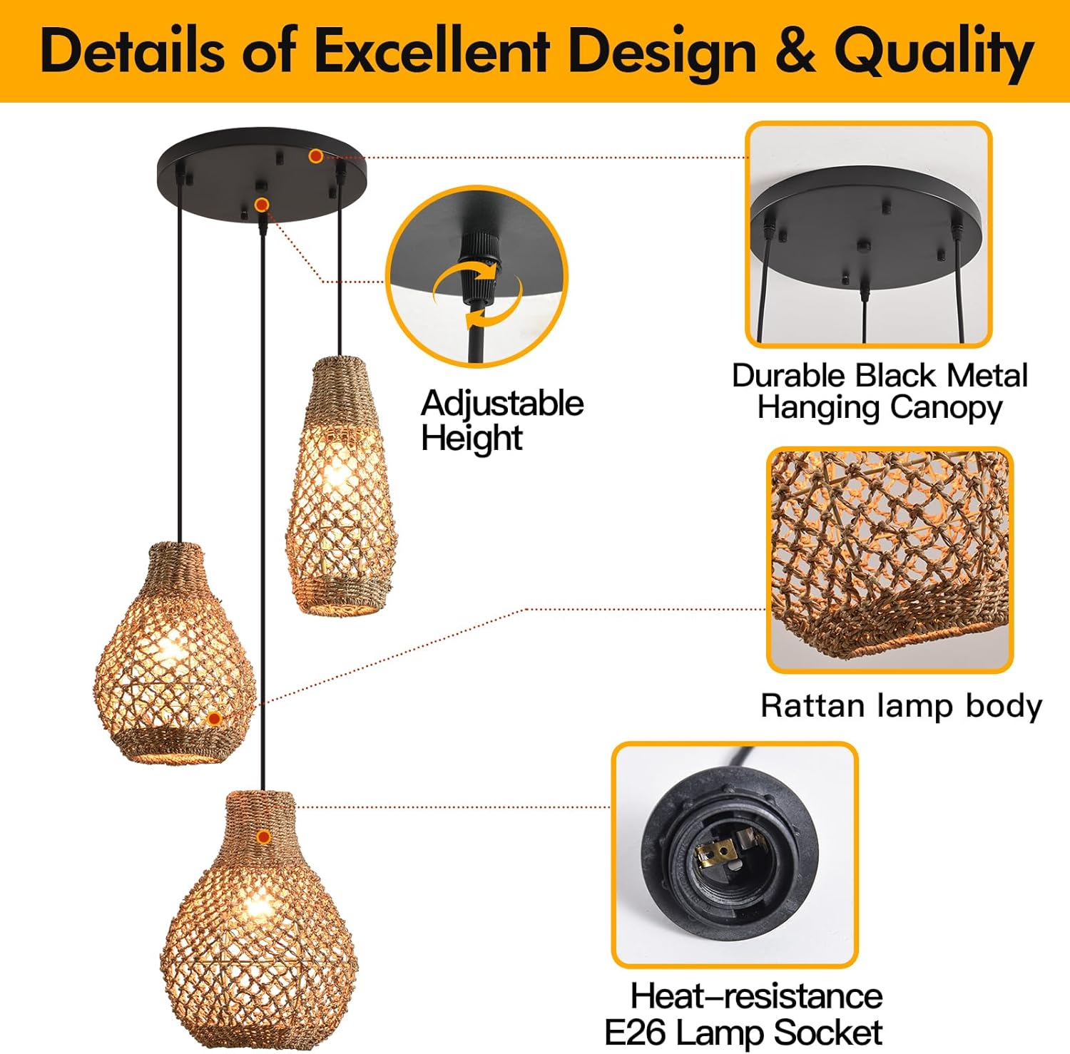 Boho Rattan Pendant Light,3 Light Coastal Woven Wicker Ceiling Hanging Farmhouse Chandelier for Kitchen Island Living Room Dining Room