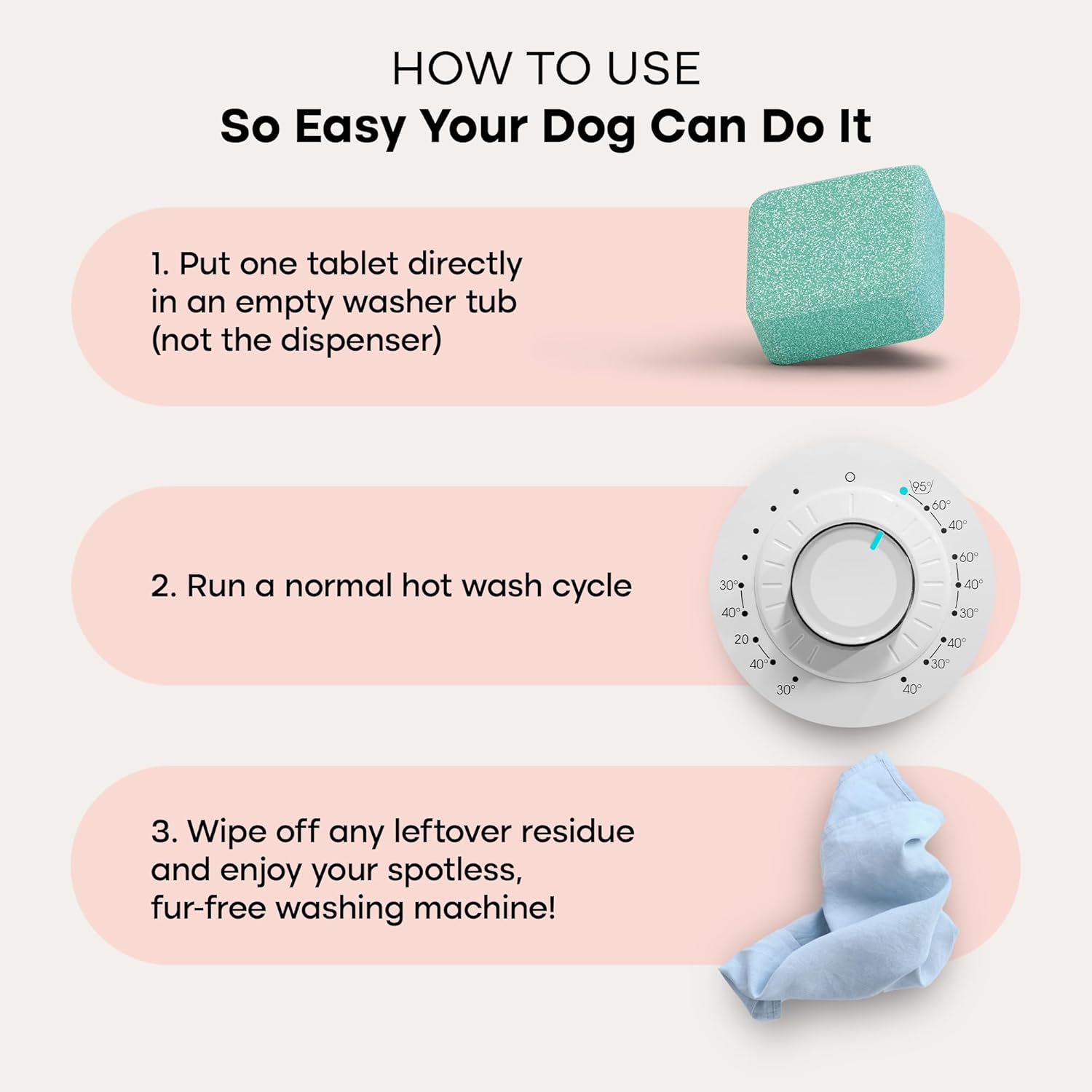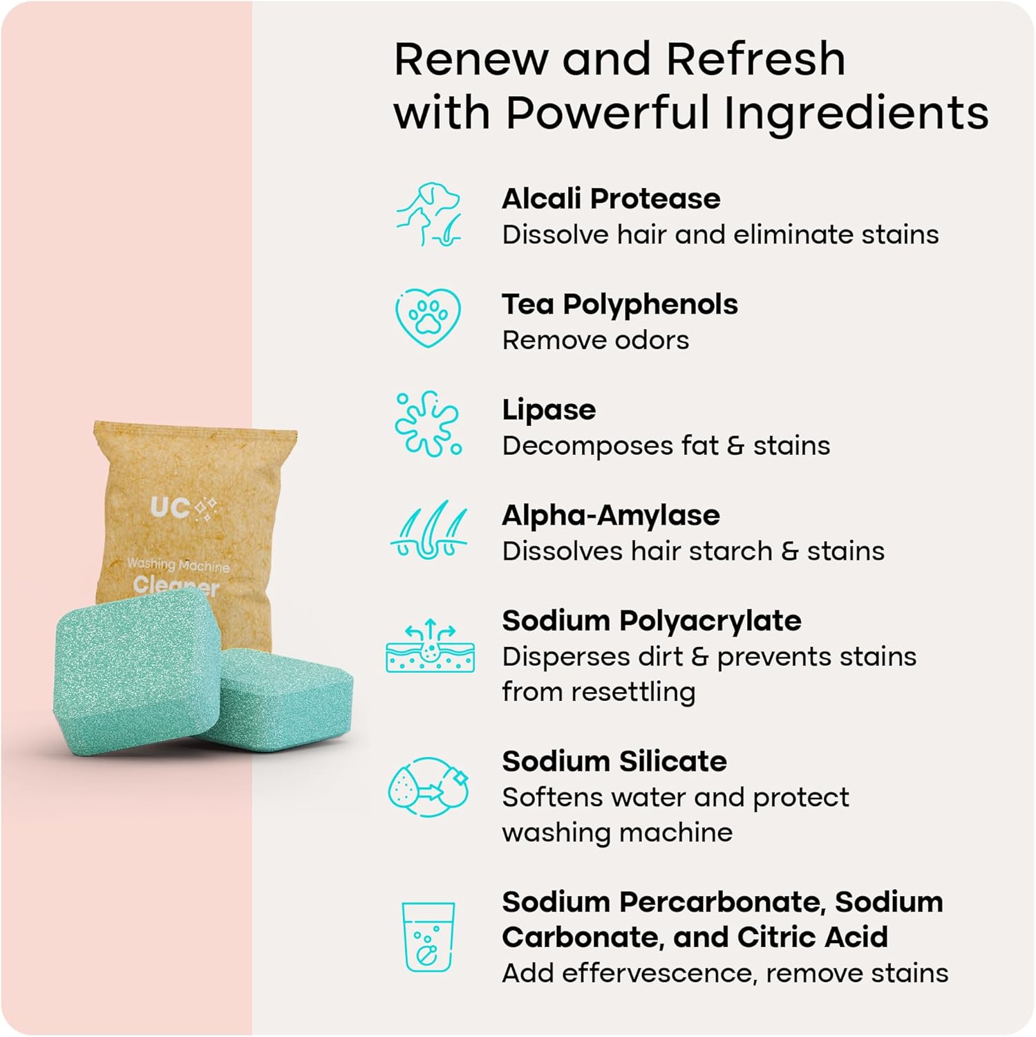 - Reduce Excessive Pet Hair Accumulation: Specially formulated for homes with pets, the special blend of active enzymes in our washer cleaner tablets helps dissolve hair and fur, reducing clogs and accumulation!