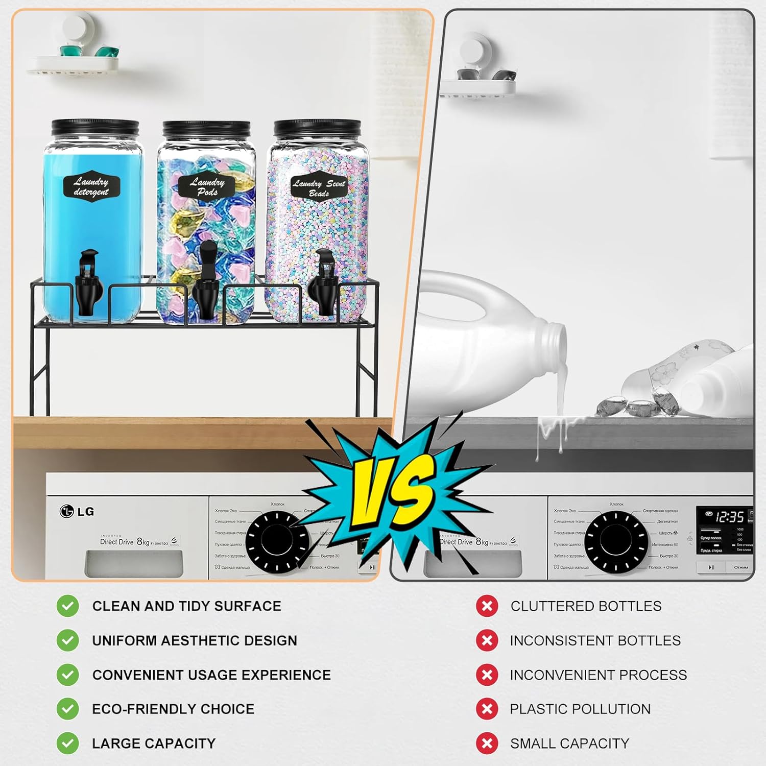 - 【Organization and Aesthetics】With a stylish design, this glass detergent dispenser set enhances the elegance and organization of your laundry room. The sturdy metal stand keeps the jars stable and orderly. Chalkboard labels are included for easy categorization and personalization, ensuring your laundry room organization jars look neat and attractive.