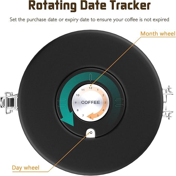 - 【Date tracking and airtightness】The coffee canister is designed with a lock, the lid is equipped with a silicone gasket, and there is a date tracking wheel on the top of the lid. The shelf life can be set when the coffee is loaded. The next time you open it, you will know how long it will be stored.