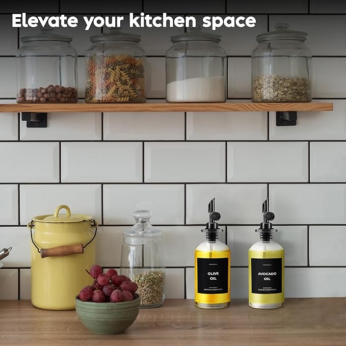 - Includes 55 Sticker Labels — Customize your glass oil dispenser thanks to the complimentary 55 waterproof and oil proof sticker labels made from PVC. Each label is minimalistic and clearly shows the contents of the bottle for convenience and decor.