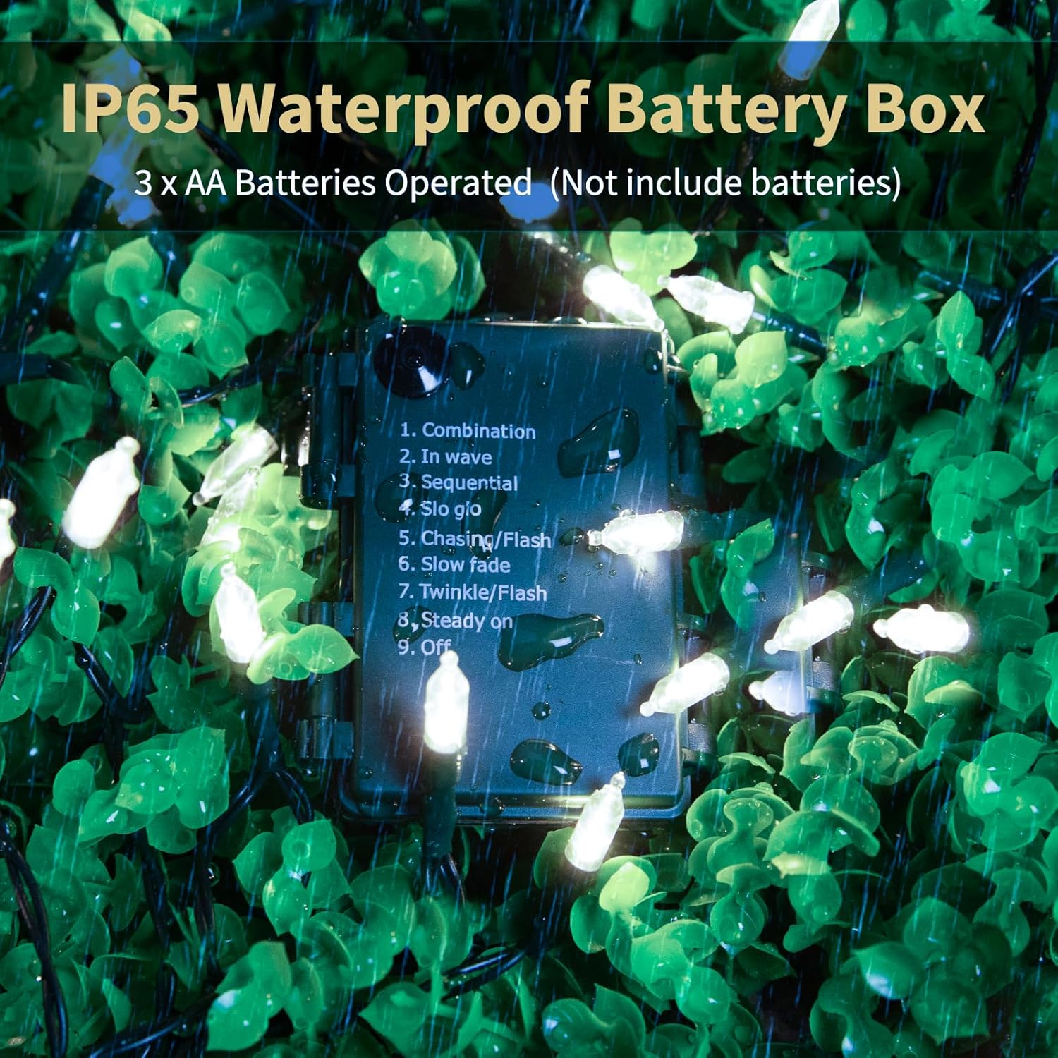 - 【Battery operated】3 AA batteries (Not included) operated, 2 pack 18 feet 50 mini LED strands, 3.94 inch lights spacing with compact water resistant battery control box, energy saving and eco-friendly. Operation time depends on the running time and the quality of installed battery