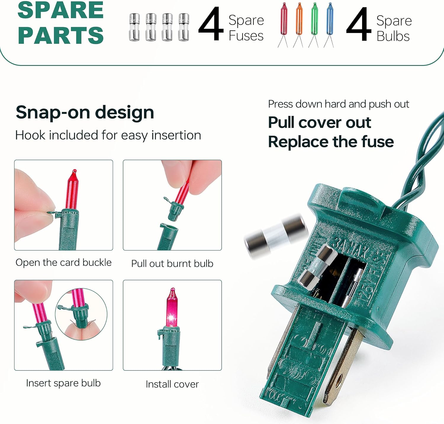 - 🎈Unique Design Christmas Lights: The bulb is designed a snap-on design, preventing their dislodgment and prolonging their working lifespan. The stackable plugs facilitate effortless installation. Just plug in and unplug for power activation and deactivation. This is a highly distinctive design. String lights Comes with 4 Extra fuse& 4 Extra Bulbs for you to replace. You can replace damaged bulbs individually with the spare bulb or fuse provided by us.