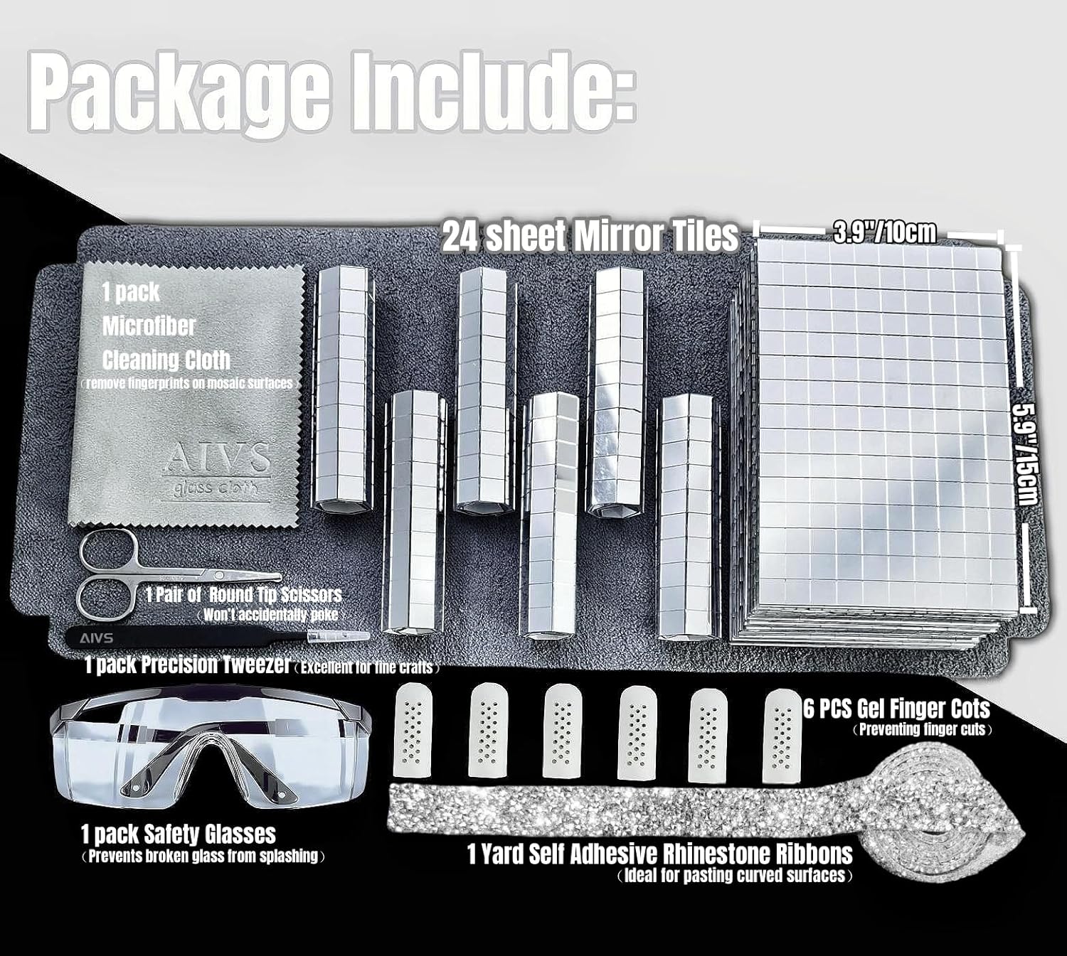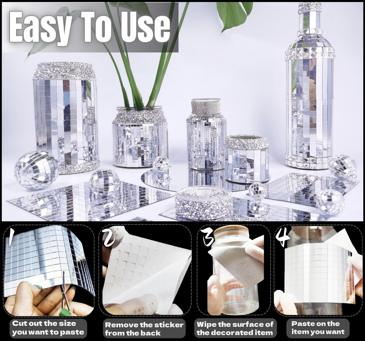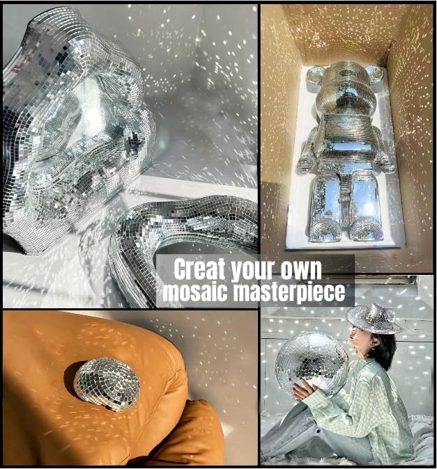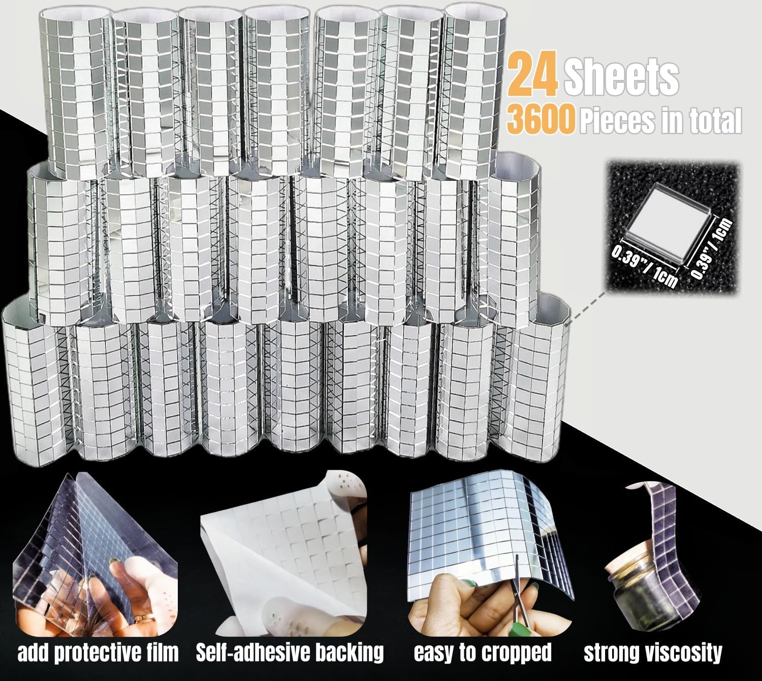 - 🔥【Spend Less & Get More】Newly upgraded with more quantity and better craftsmanship, DIY accessories are provided.Come with 24 sheets Mini Mosaic Stickers,1 roll rhinestone ribbon,1 scissors,1 tweezer,1 galss cloth and 6 silicone fingertips.Each Disco Ball Mirror Tile contains 150 1cm x 1cm square mosaics for a total of 3600 pieces,quantity sufficient for use.