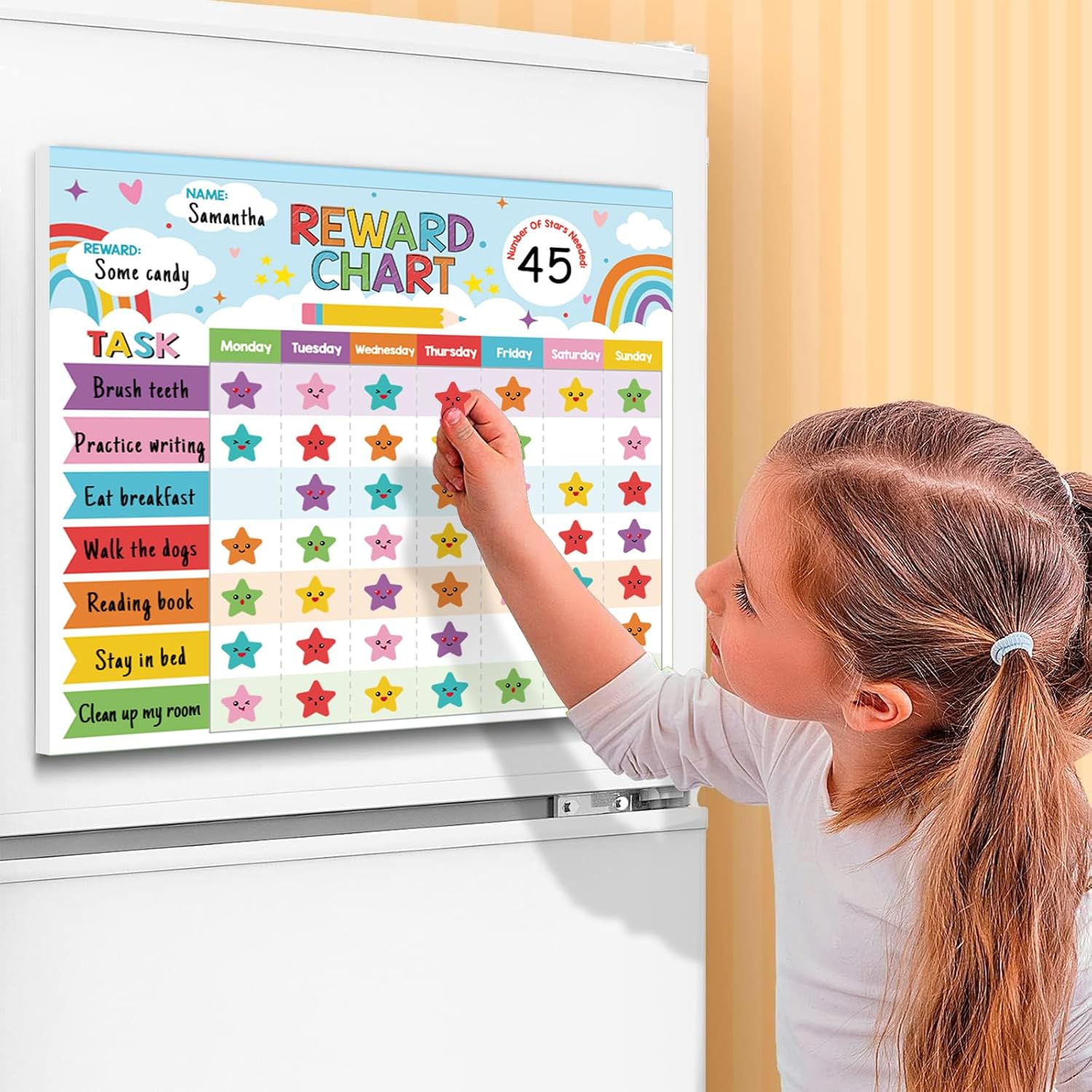 - Easy to Use: parents will love this reward chart for kids at home,if you want to focus on enhancing your child's skills or setting a goal, this rainbow star sticker chart can be easily adjusted according to the agreement between you and your child. You can complete one chart per week or use multiple charts for multiple children,you can flexibly write down name,reward,goal and implement it.