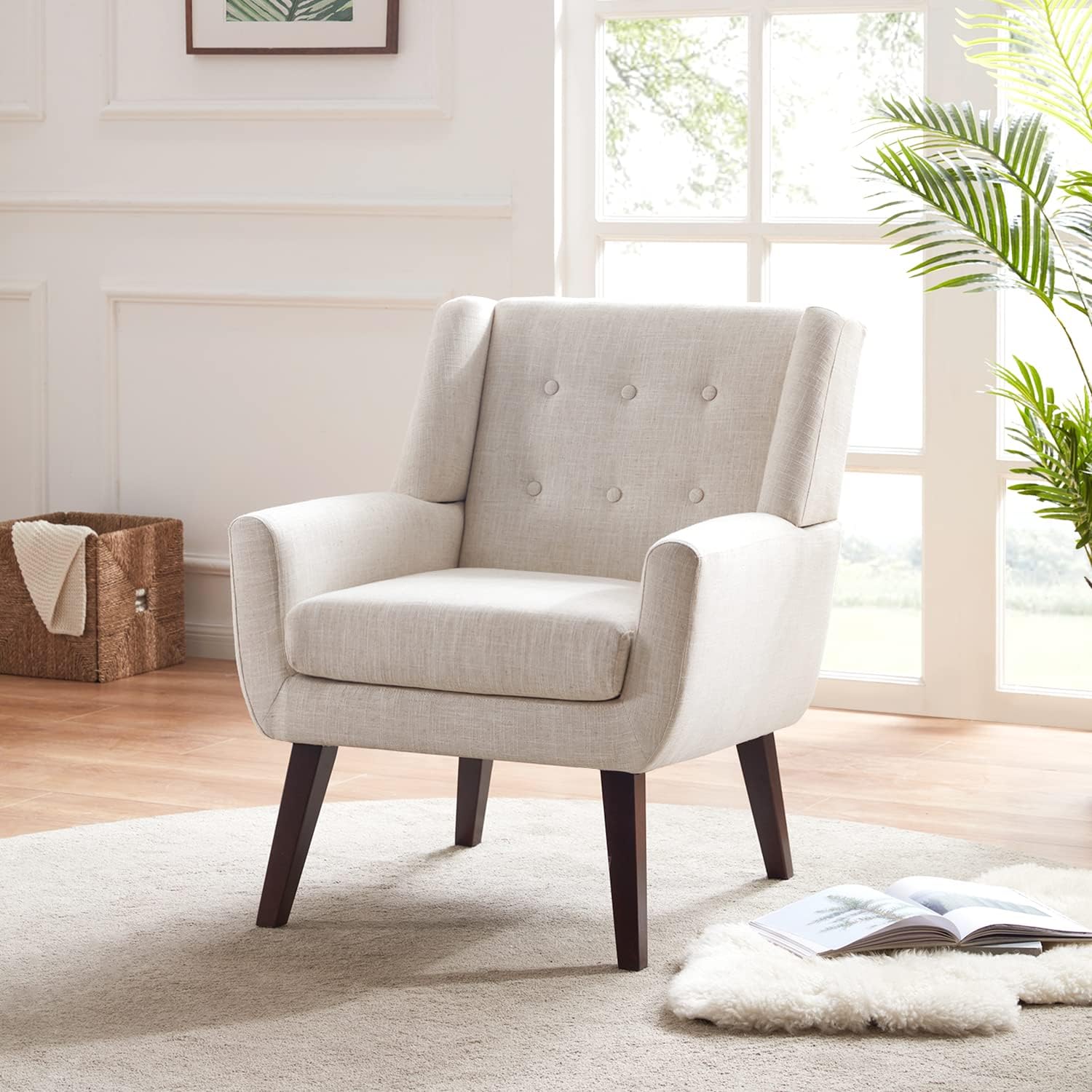 HUIMO Accent Chairs Set of 4, Upholstered Button Tufted Armchair, Linen Fabric Sofa Chairs for Bedroom, Living Room, Mid Century Modern Comfy Reading Chair (4, Beige)