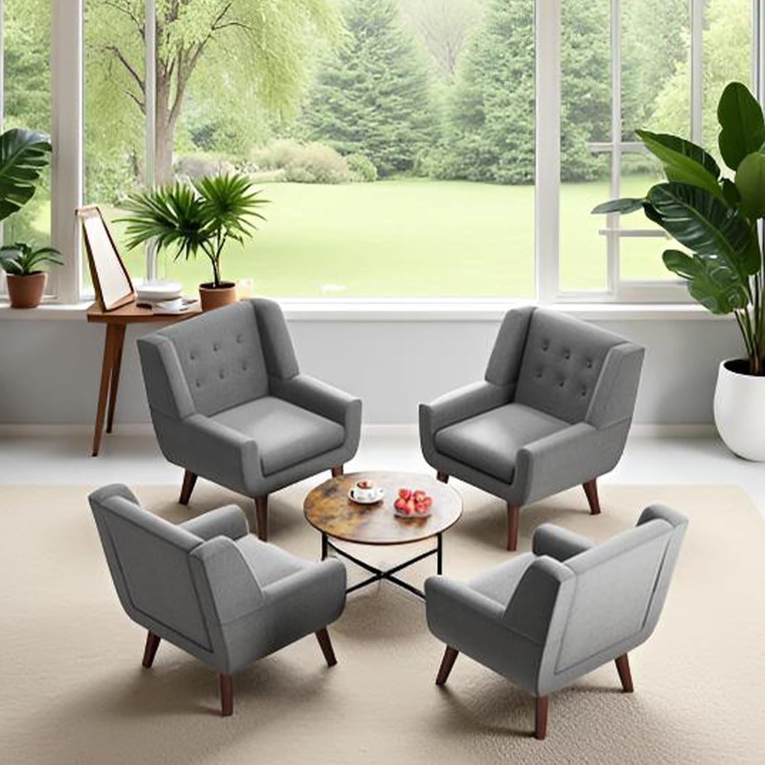 HUIMO Accent Chairs Set of 4, Upholstered Button Tufted Armchair, Linen Fabric Sofa Chairs for Bedroom, Living Room, Mid Century Modern Comfy Reading Chair (4, Light Grey)