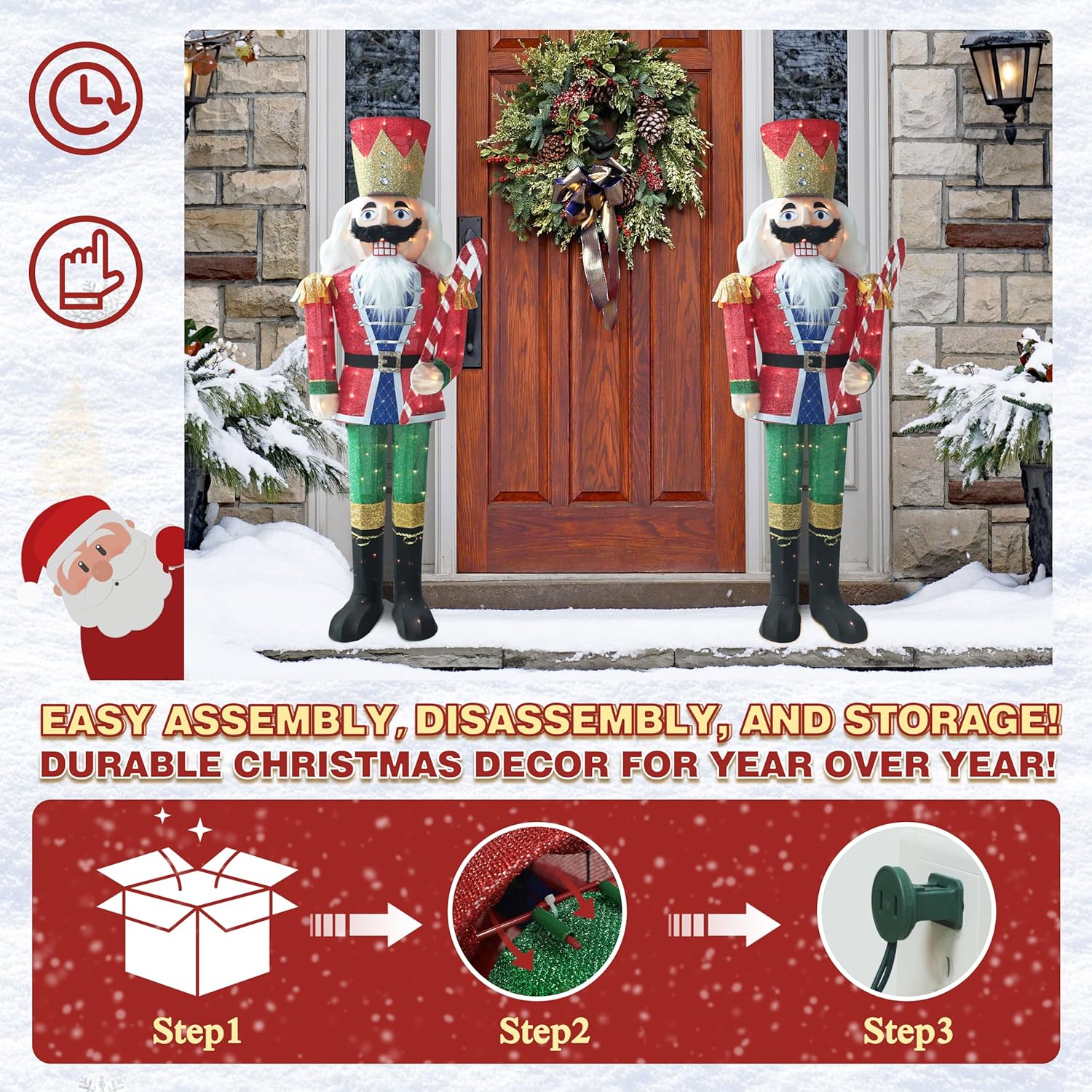 - [Easy to Assembly] It only takes 3 steps to assembly. Step 1: Take out all the items from the package. Step 2: Assemble it according to the instructions. Step 3: Plug in the socket to light it up. If you are going to use this nutcracker for outdoor, don’t forget the ground stakes included that will make it well fixed on the ground.