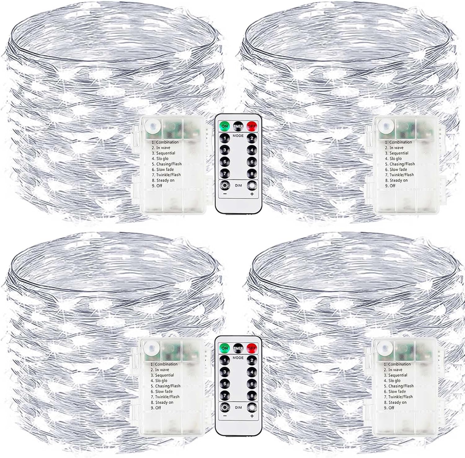 - Upgraded Christmas twinkle lights: Designed with ultra-bright LEDs and durable silver wire, these battery fairy lights are built to last and make an excellent choice for decorating bedrooms, centerpieces, balconies, and porches. Each set includes 4 strands of lights and 2 remotes, each 33ft long with 100 LEDs, powered by 3 AA batteries (not included)