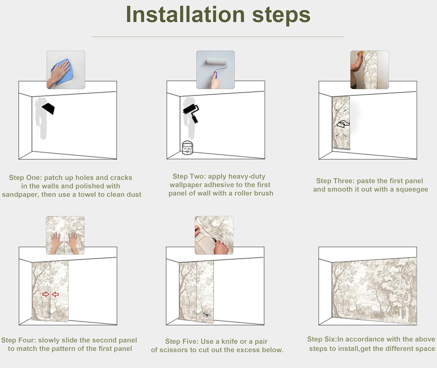- INSTALLATION - 1.Fill in all cracks or holes and clean dust dirt and grease on the wall surface. 2. Apply the heavy duty wallpaper paste on the wall not mural. 3. Use a spirit level to mark first strip location. 4. match the pattern by sliding into place. 5.use a scraper to smooth out bubbles press. 6. Let dry for a few minutes and that's it! Please Note: Not self-adhesive. We recommend to use a standardized fleece wallpaper paste.