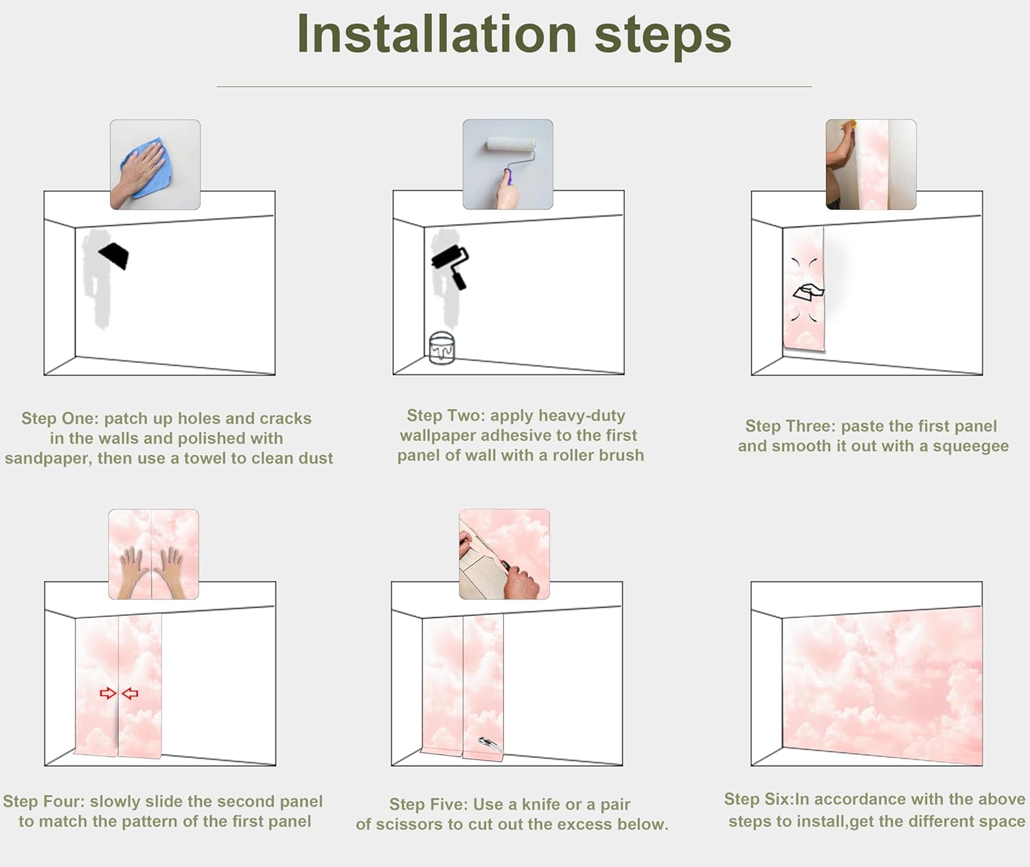 - INSTALLATION - 1.Fill in all cracks or holes and clean dust dirt and grease on the wall surface. 2. Apply the heavy duty wallpaper paste on the wall not mural. 3. Use a spirit level to mark first strip location. 4. match the pattern by sliding into place. 5.use a scraper to smooth out bubbles press. 6. Let dry for a few minutes and that's it! Please Note: Not self-adhesive. We recommend to use a standardized fleece wallpaper paste.