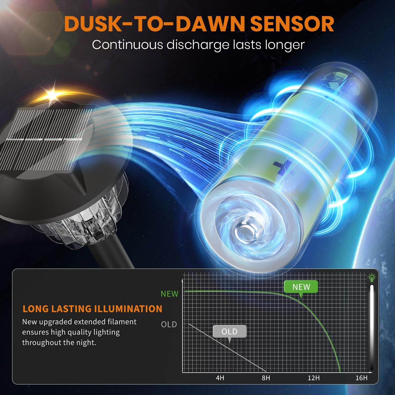 - SOLAR LANDSCAPE LIGHTS: Our upgraded solar pathway lights draw inspiration from the cosmos, boasting a unique and durable construction. The sleek and modern design effortlessly complements the surrounding landscape, creating a lovely ambiance. Bringing a touch of magic to your garden and creates a warm and inviting atmosphere. Solar outdoor walkway lights are designed to provide an attractive pattern, lights up your garden at night.