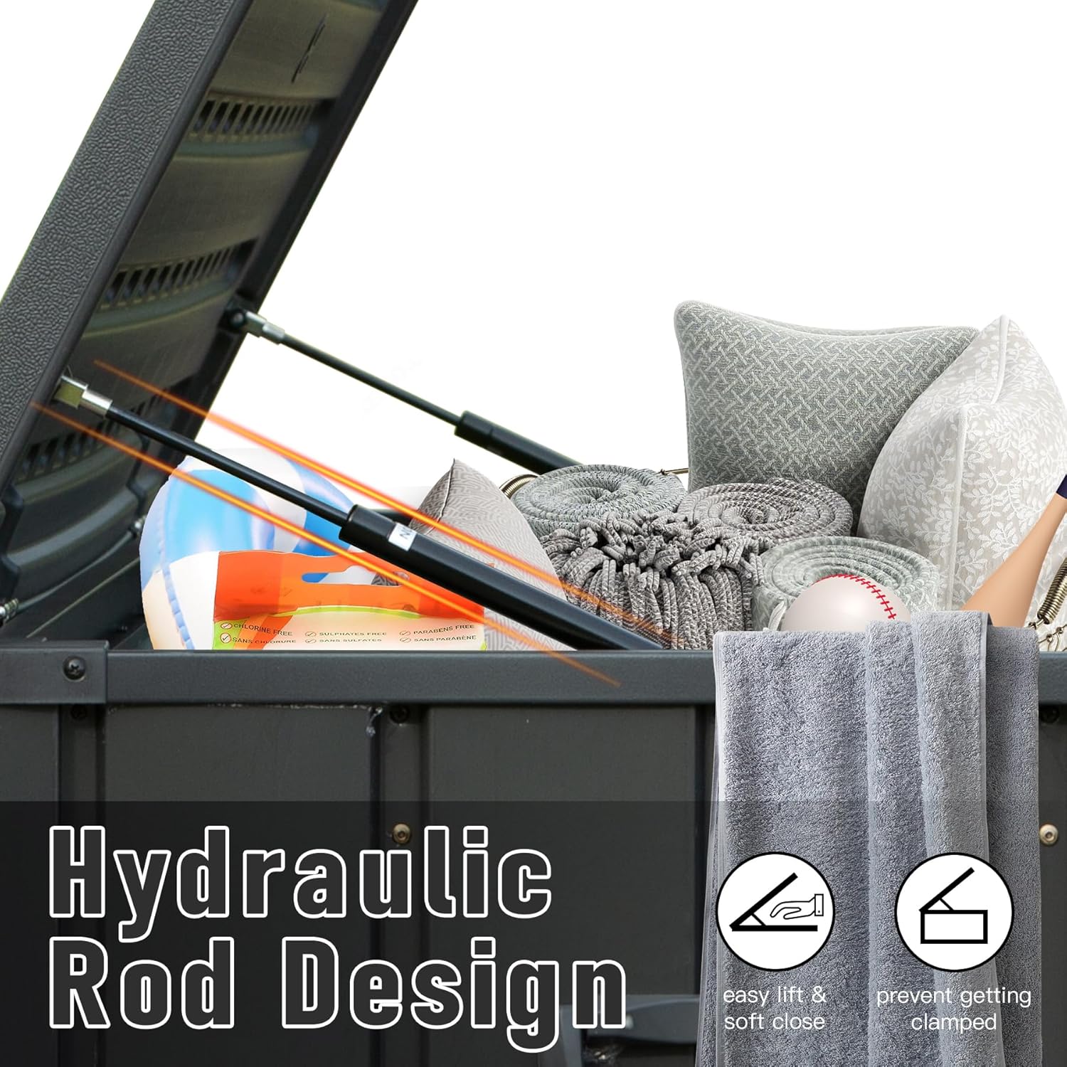 - 🌞【Humanized Hydraulic Pistons】: The resin deck box with easy lift and soft close mechanism, allows the top completely open and shut smoothly with minimal effort-easy to use and no smashed fingers.