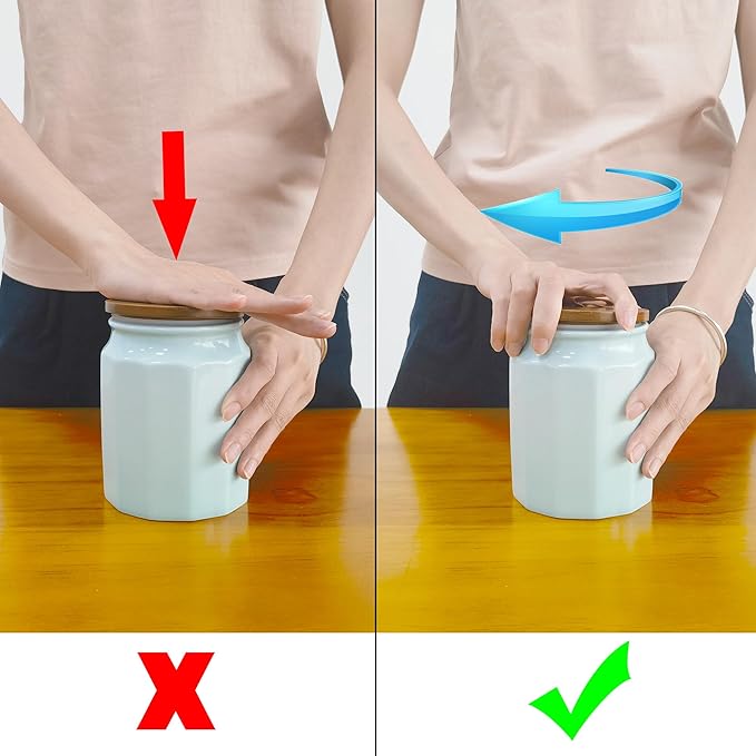 - 【Easy to Use and Clean】Please don't directly to direct downward pressure on the lid, The best way to seal is to twist the lid and press it at the same time.The sugar flour container set for counter set features a large diameter jar mouth design, which can be quickly and easily filled or cleaned. The ceramic kitchen canisters is dishwasher safe, and the wooden lid can only be hand washed and needs to be wiped dry in time.