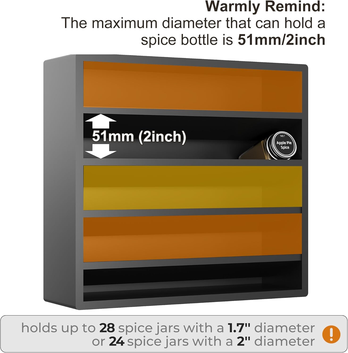 - Warmly Remind: The maximum diameter that can hold a spice bottle is 51mm/2inch.