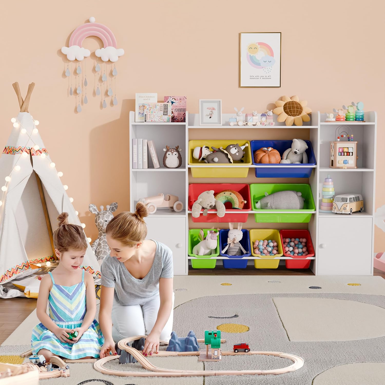 - Multi-Functional Storage Solution - Our kids toy organizer is made of sturdy wood and includes 4 open book shelves, 2 storage cabinets, and 8 colorful toy bins. With its large capacity, it can store approximately 120-160toys and 80-100 books, providing the perfect storage space for your child.