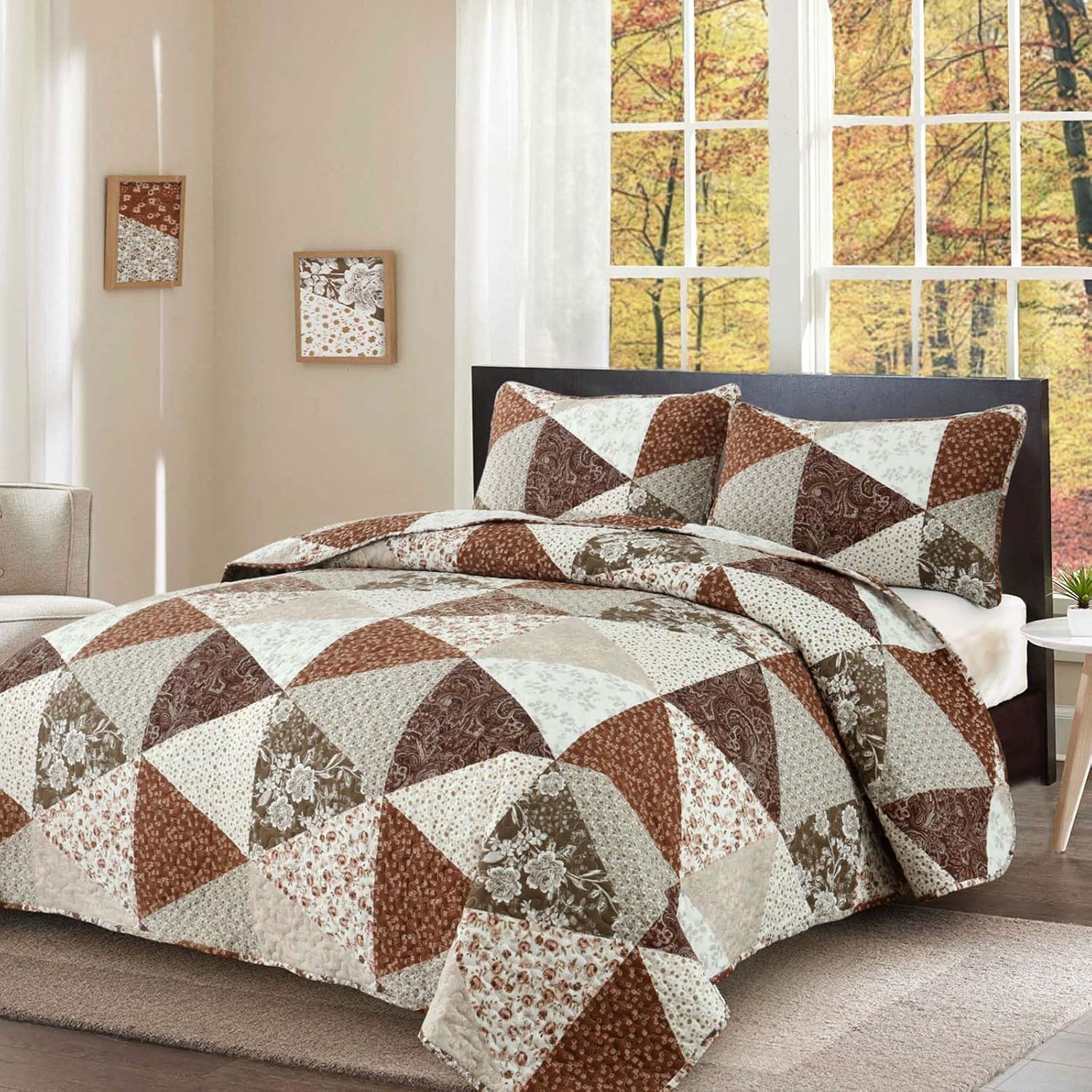 Dobuyly Fall King Size Bedspread, Brown Floral Triangle Patchwork King Size Quilt Fall Bedding Set, Soft Lightweight Microfiber Coverlet Set (1 Quilt, 2 Pillow Shams)