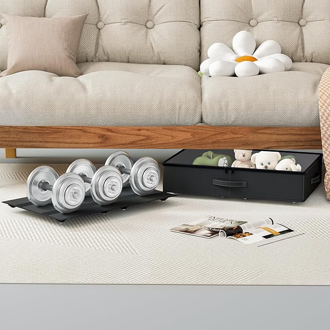 - [Strong Weight-Bearing Capability]: Made of durable oxford fabric, our underbed storage is built to withstand heavy weights. The bottom bracket is reinforced with hard wood, providing superior support compared to other elastic band structures. You can confidently store items weighing up to 40 pounds, such as books, However, when placing heavy objects above, please be careful to move slowly to prevent the wheels from being damaged by excessive lateral force!
