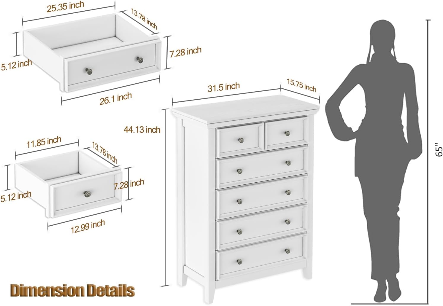 - 【Ample Storage Space】The dimension of the assembled dresser is 15.75"D x 31.5"W x 44.13"H. The smaller drawer measures 13.78"D x 11.85"W x 5.12"H and the bigger drawer measures 13.78"D x 25.35"W x 5.12"H to store a variety of items