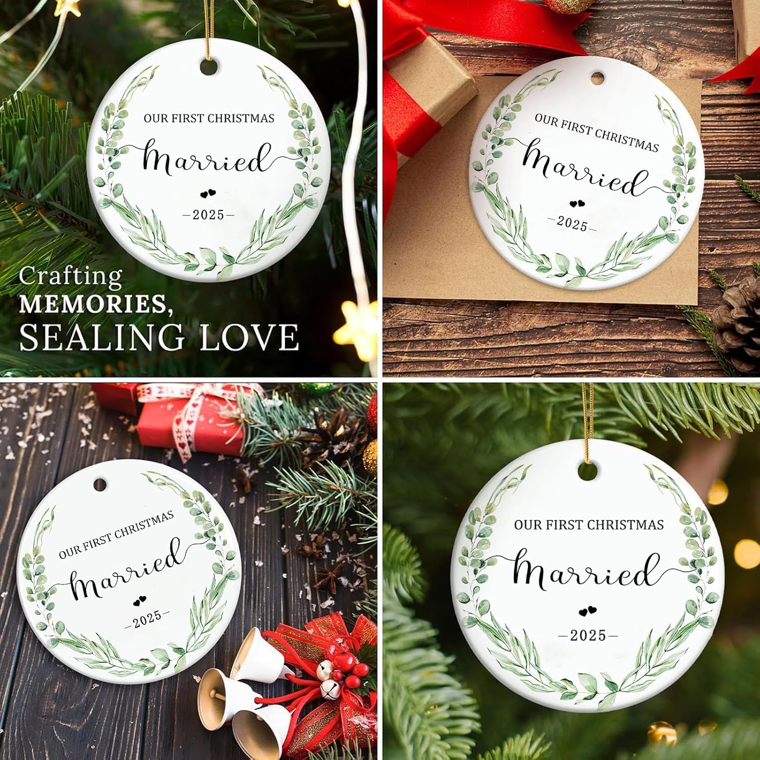 - 【Premium Material】Made from premium ceramic , this 1st Christmas married ornament 2025 ornament is designed for durability and lasting beauty. The dual-sided printing features intricate and vivid designs that won’t fade over time. This premium material of first married Christmas ornament 2025 ensures the ornament remains a cherished keepsake for your family's special moments.