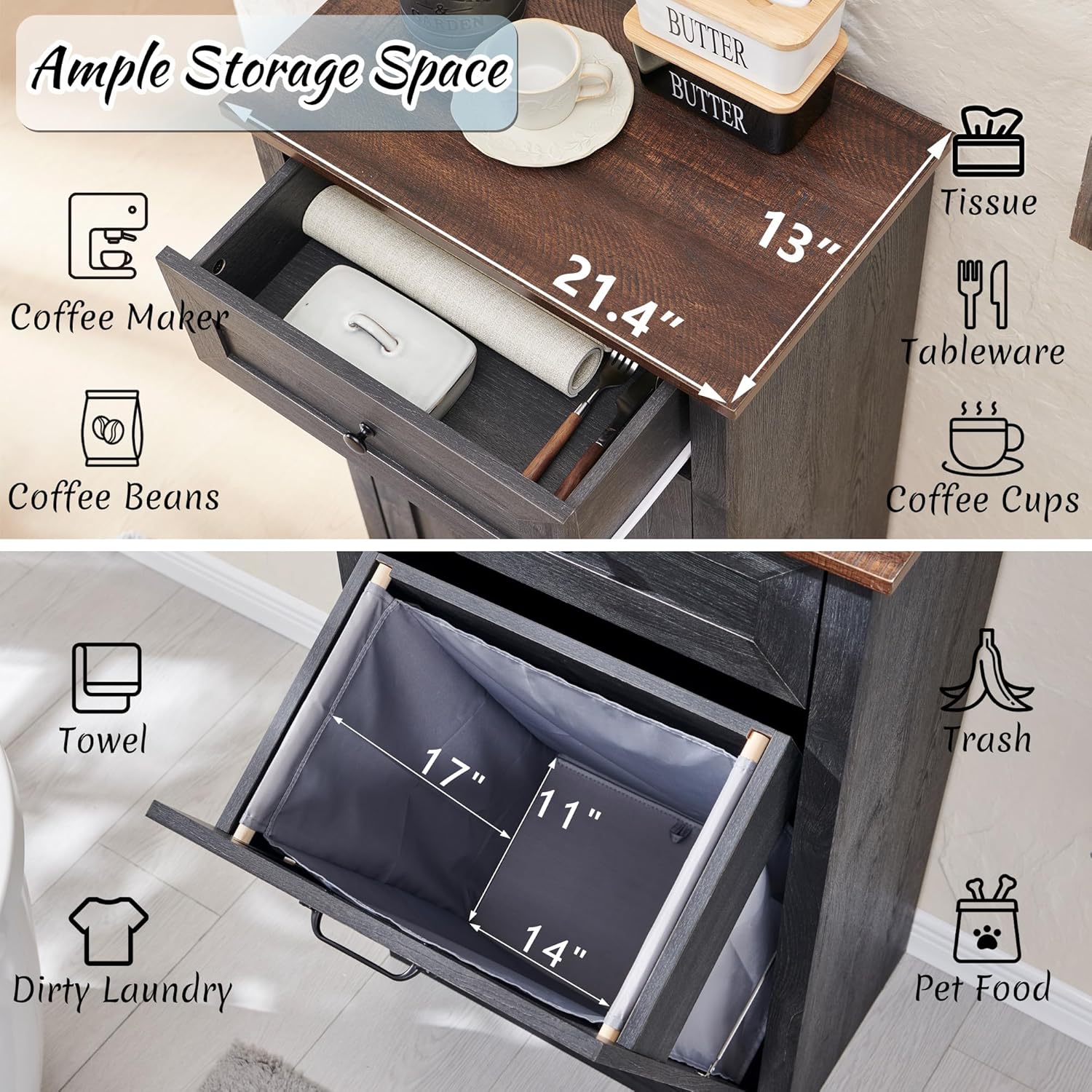 Tilt Out Laundry Hamper Cabinet, 10 Gallon Farmhouse Trash Can Cabinet with Drawer, Hidden Wood Garbage Can Bin Cabinet with Laundry Storage Basket for Bathroom, Kitchen, Dark Grey