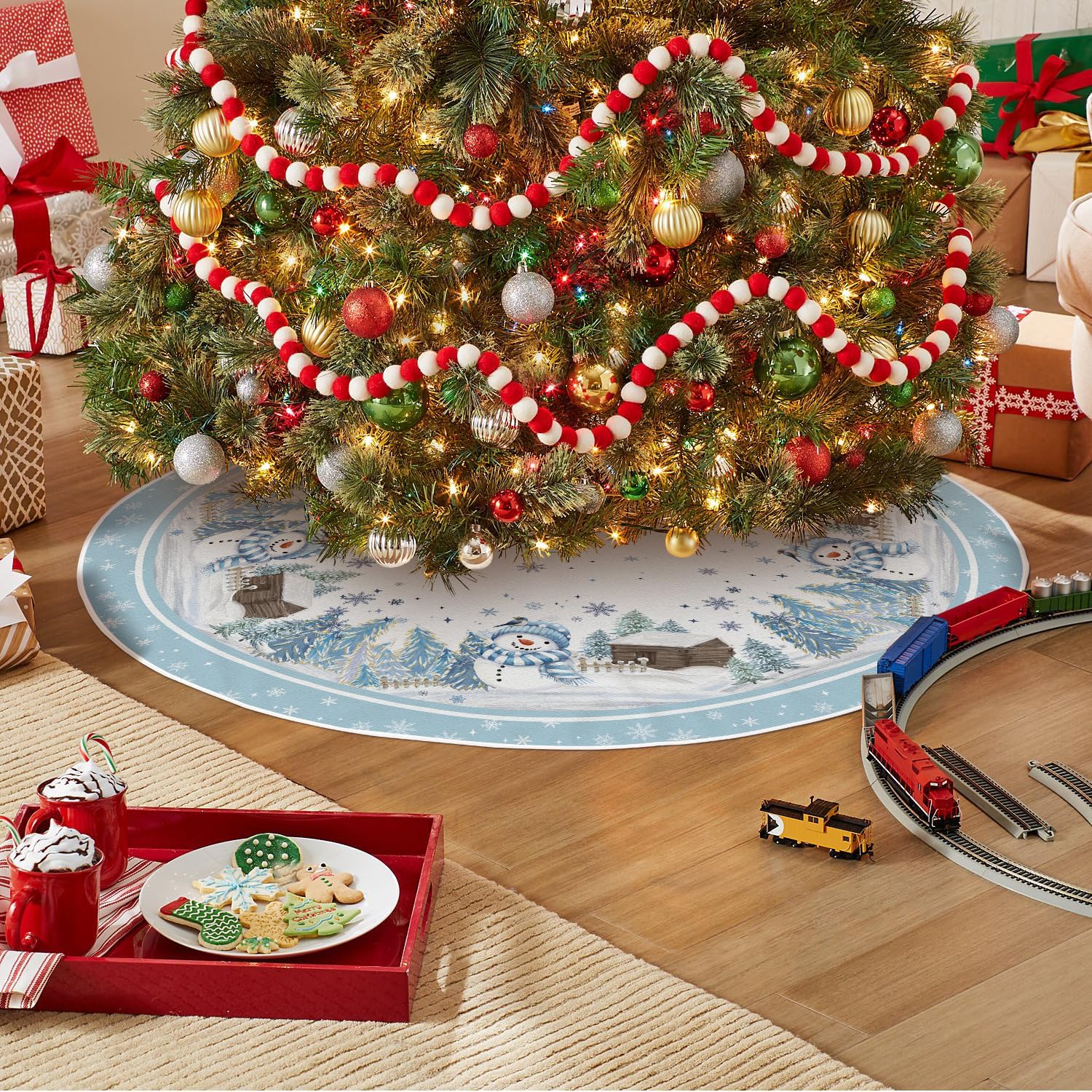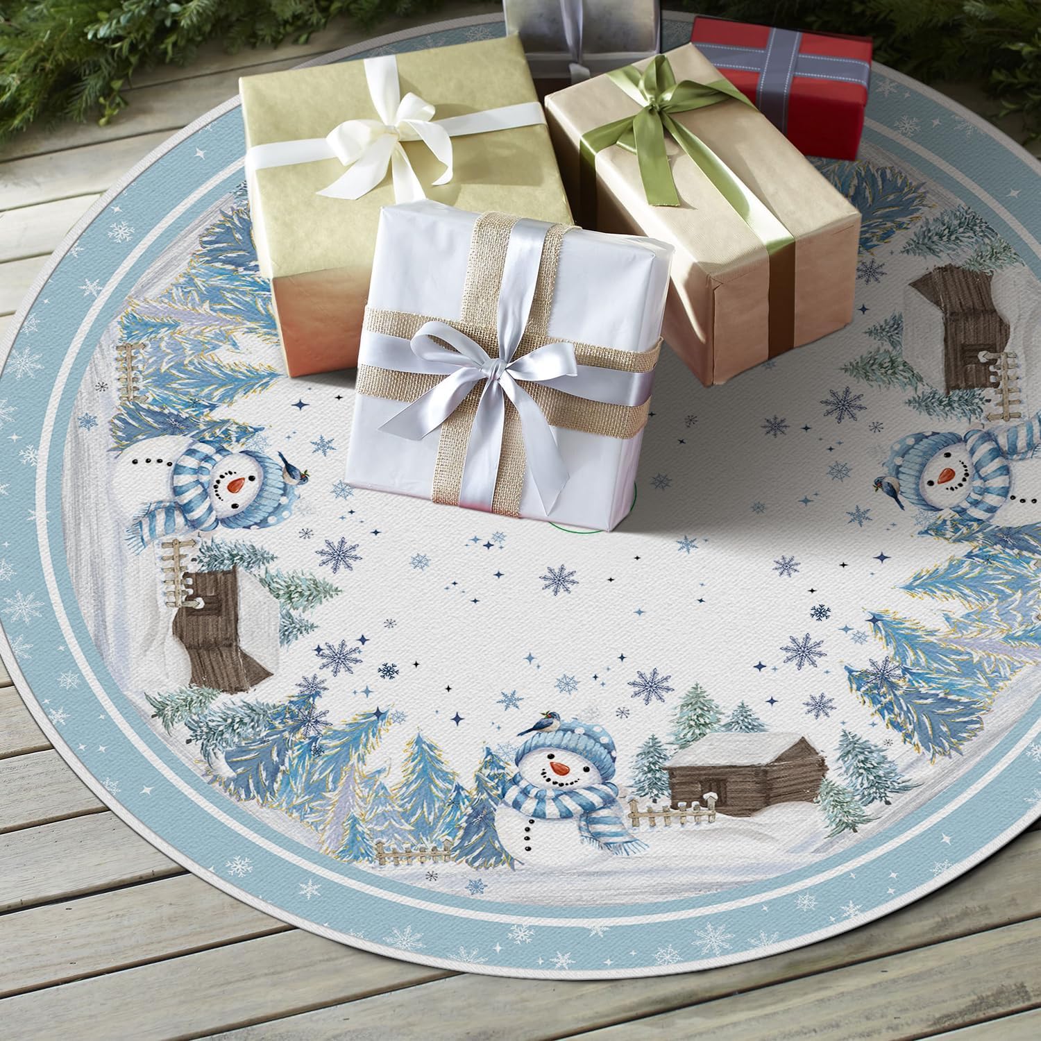 AVOIN colorlife Snowflake Snowman Cardinal Christmas Tree Skirt 48 Inch, Winter Holiday Tree Mat Decoration