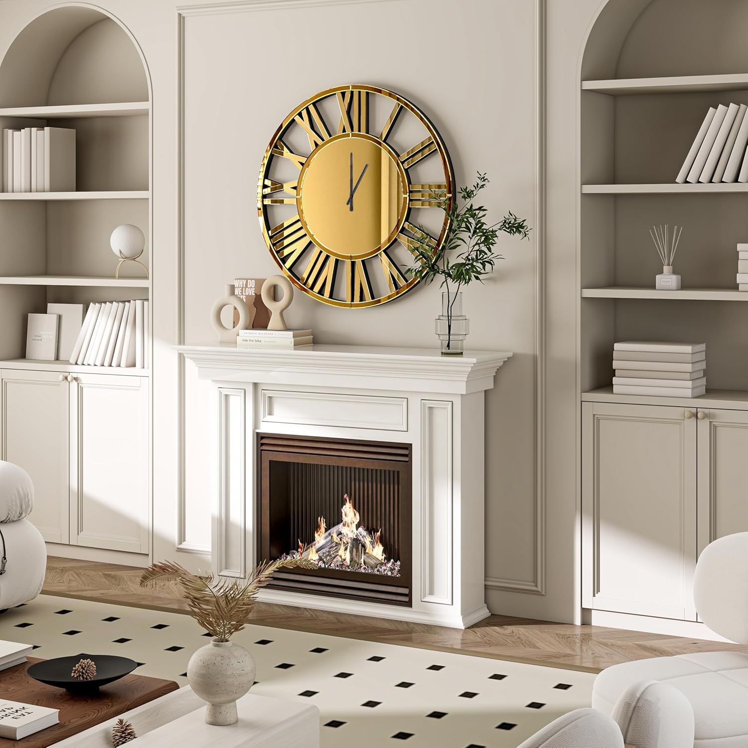 - 【Premium Materials】Constructed with a 4mm thick gold mirror and sturdy MDF backing, the wall clock is equipped with a silent sweep mechanism for accurate timekeeping. The one-piece movement cover safeguards the mechanism, while two robust D-ring hooks guarantee the stability of this large wall clock for enduring use.