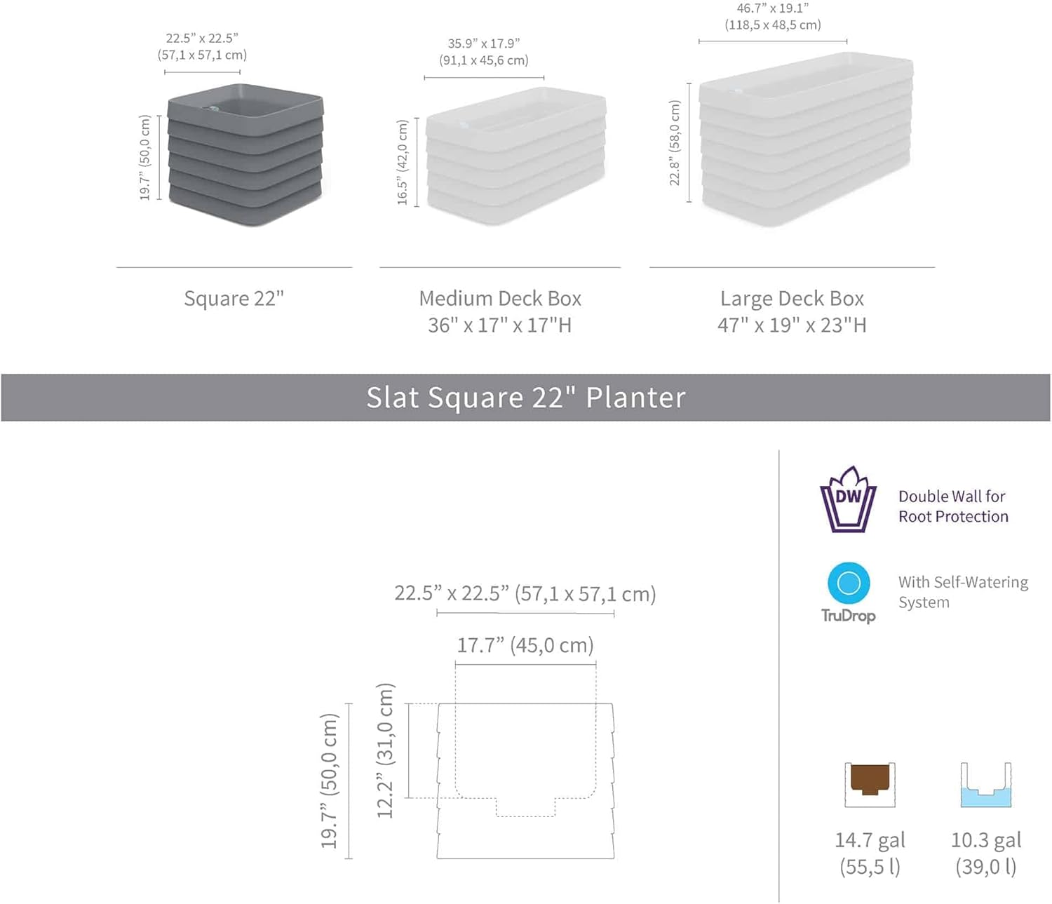 Crescent Garden TruDrop Self Watering Slat Square Box Planter - Indoor Outdoor Planter Box with Built-in Reservoir & Water Level Indicator, All Weather Flower Pot, 22'' (Slate Gray)
