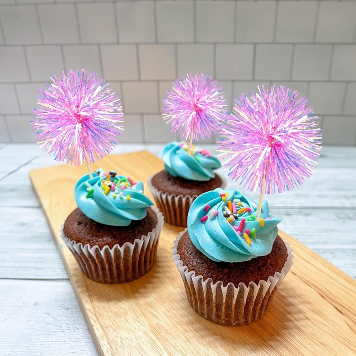 Ephlyn 30Pcs Foil Firework Cupcake Toppers Party Birthday Cake Toppers Supplies Sparkle Tinsel Cocktail Fruit Toothpick for Birthday Wedding Graduation Party Rose Red