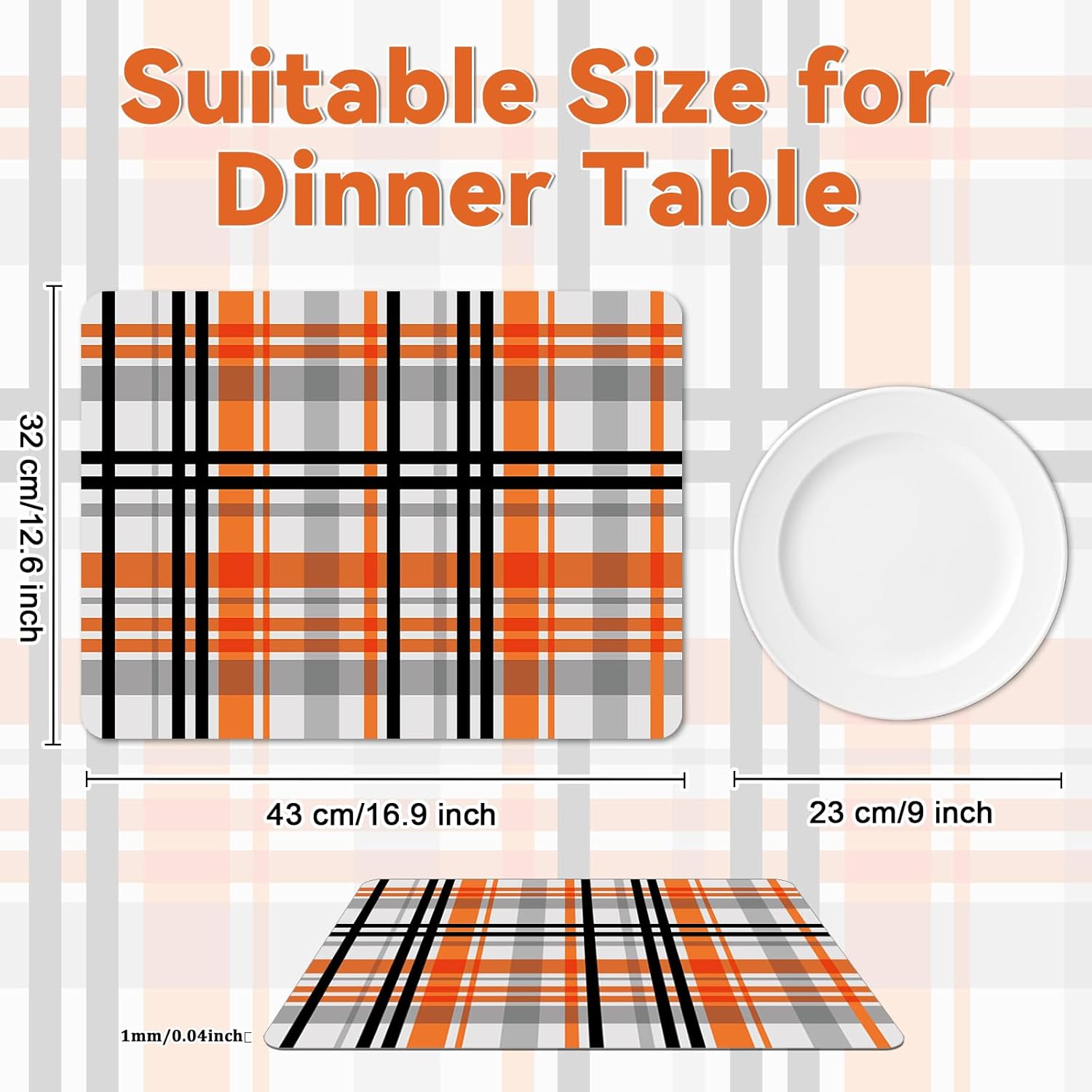 - Package includes:This set includes 6 pieces halloween orange black buffalo plaid placemats, offering a generous quantity to easily accommodate your family and guests.Orange black placemats provide ample coverage for your dining table; keeps your tableware stay protected from spills and stains, allowing you to focus on creating cherished memories with your loved ones.