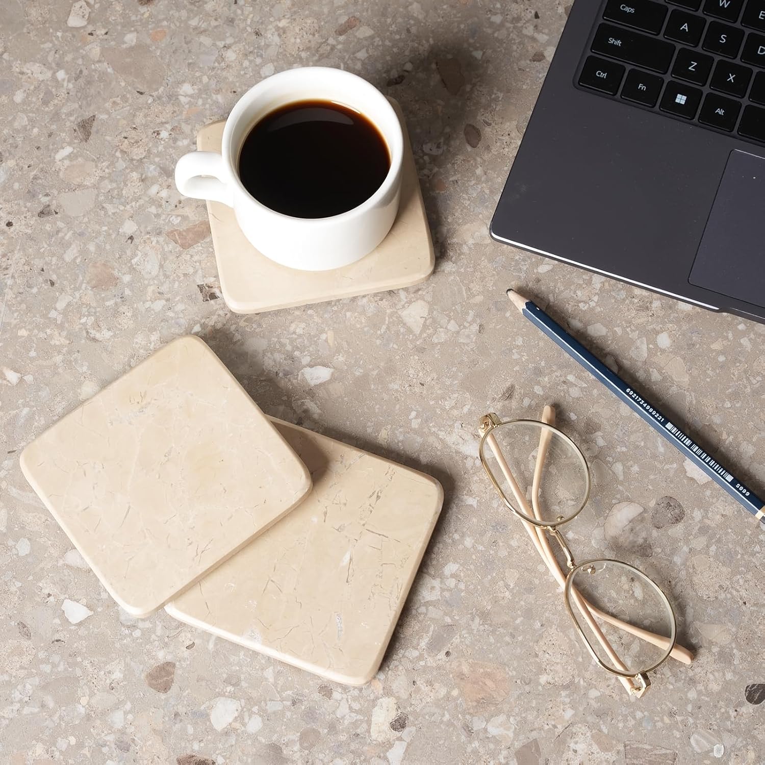 - Premium Solid Marble Coasters Set of 6 - Handcrafted from natural Crema Beige marble, these square coasters feature unique veining for elegant table decor. Ideal for elevating your coffee table, office desk, or bar setup with timeless luxury