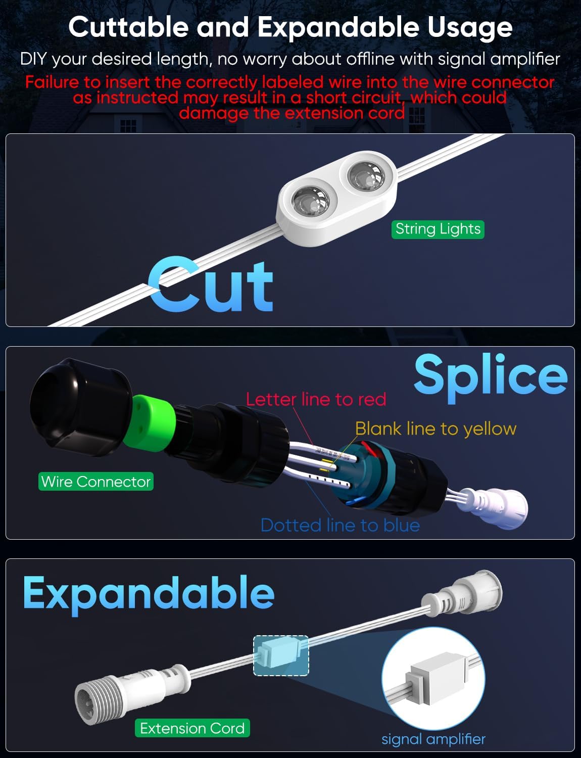 - Cuttable and Expandable: The outdoor permanent led lights can be cut and extended by connecting an extension cord through wire connector set when specific area encountered. The extension cord can amplifiy the signal, up to 32.8ft/10m, ensuring that the whole lights set maintains a stable signal. If it is necessary to cut the light string, please refer to the installation guide for the correct installation method. (Failure to insert the correctly labeled wire into the wire connector as instructed may result in a short circuit, which could damage the extension cord with signal amplifier)